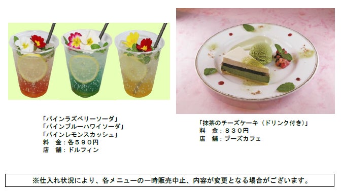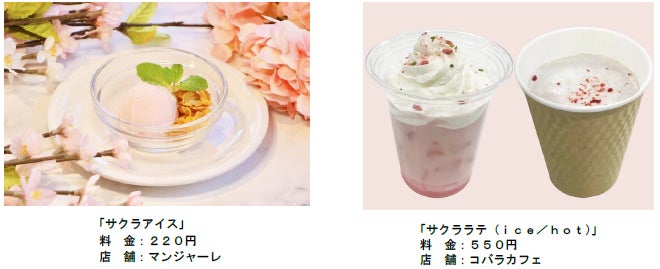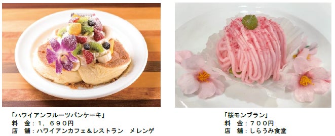 『#はなパラ』の期間中、島内のレストランや軽飲食店舗では、花のフードメニューをご用意いたします。桜をモチーフにした「桜モンブラン」、「サクラアイス」、「サクララテ」など、期間限定のフードやドリンクで春のお花見シーズンを盛りあげます。