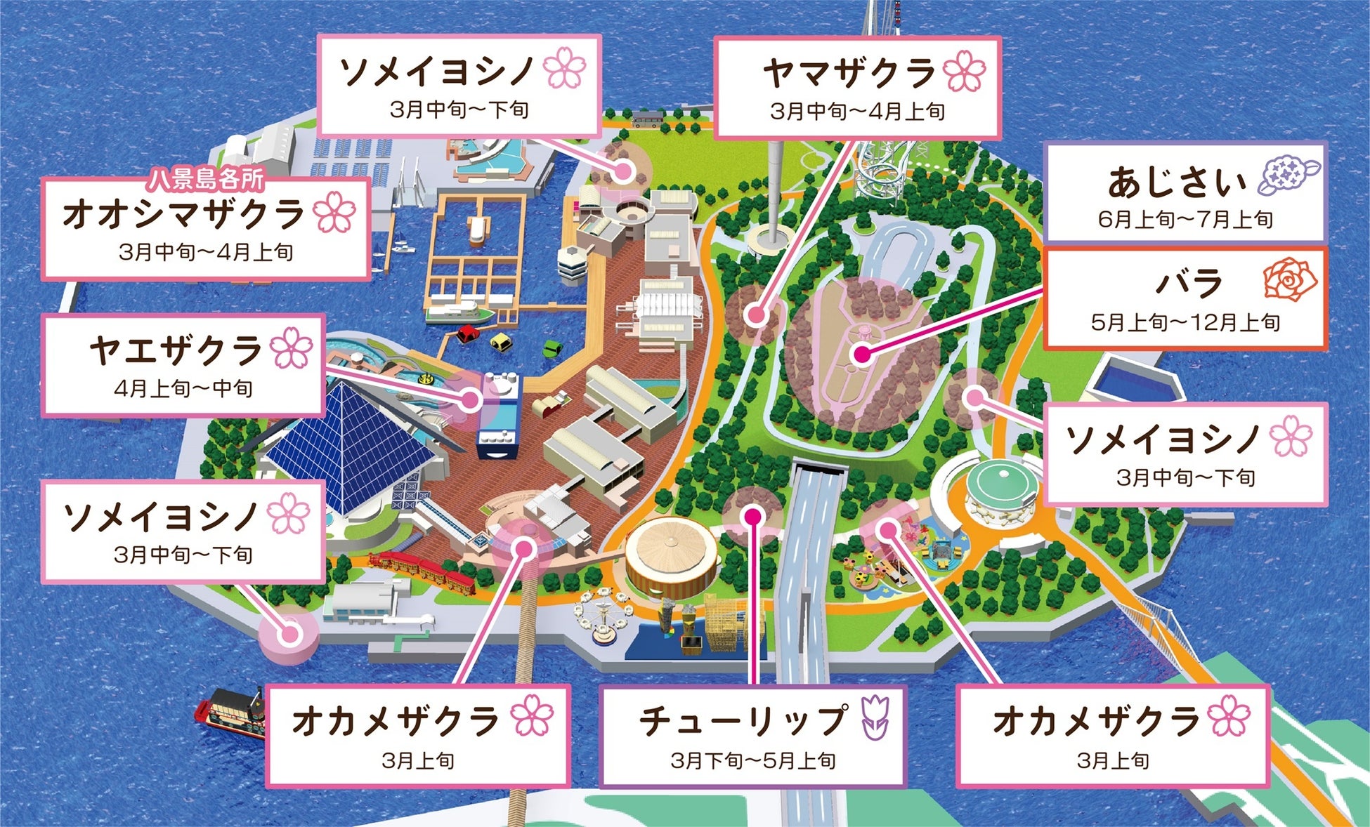 『#はなパラ』期間中、八景島では3~4月にソメイヨシノやオオシマザクラなど約5種700本の“桜”が、5~6月には約100種500株の“バラ”や2万株の“あじさい”が咲き誇り、島全体が色彩豊かな花の島となります。