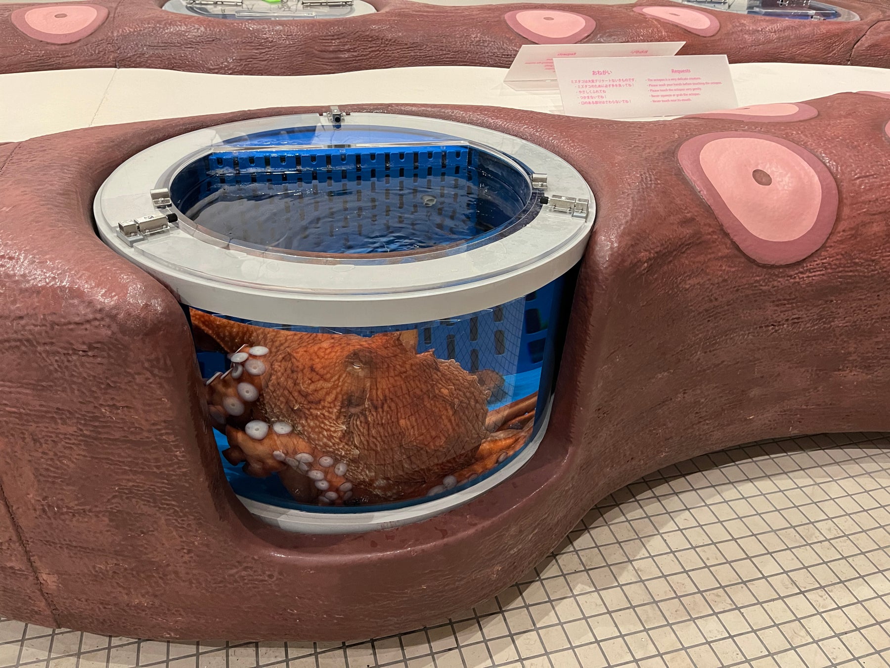 見て・ふれて・楽しく学べるというキャッチフレーズ通り、タコの足に掴み込まれた大小6基の水槽でミズダコとふれあうこともできます。