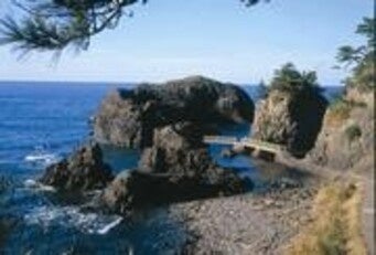 東尋坊と同じ柱状節理の岩が織り成す景観の中、一風変わった岩が点在するほか、散策路を辿ると小島に渡ることができたり洞穴を覗くこともできます。越前松島水族館や宿泊施設が隣接し、家族連れや遠足でにぎわう観光地となっています。