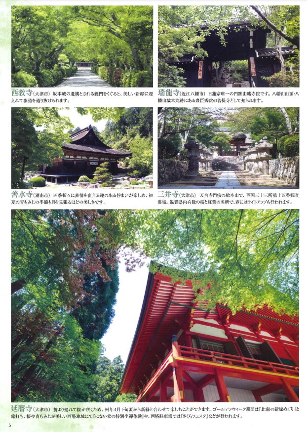 春から初夏にかけて楽しめる、桜や新緑の情報をまとめたパンフレットを発行しました。おすすめ桜・新緑スポットや、この時期ならではの各寺社による特別拝観などイベント情報を掲載しています。期間限定で授与される特別御朱印も必見。終盤では、紫式部ゆかりの地の紹介や、紫式部や『源氏物語』にちなんだグルメ情報も紹介しています。なお、パンフレットは大津市内の観光案内所や宿泊施設などで配布されています。