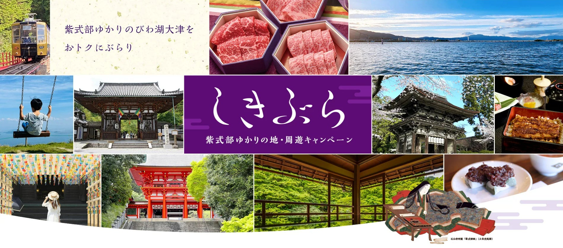 おトクに市内をめぐる周遊キャンペーン『しきぶら』を開催中。対象施設や店舗で「大河ドラマ館」「恋するもののあはれ展」や石山寺などのチケットを提示すると特典を受けることができます。