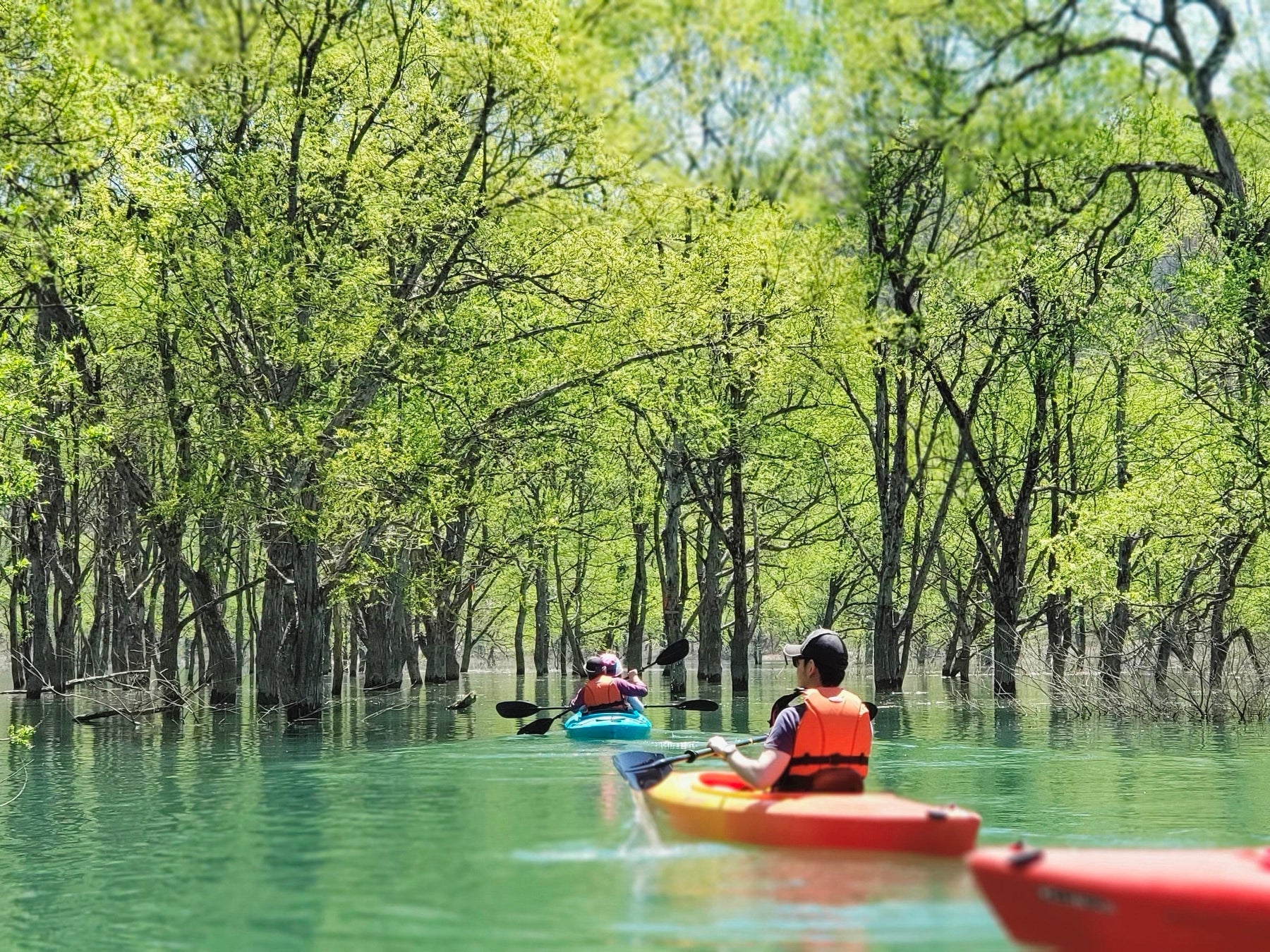 水没林は湖岸公園からもよく見えますが、水面に映る青い空や新緑の木々に抱かれるカヌーツアーは特別な体験です。フルレンタル可能で、老若男女、初心者でもお楽しみいただけます。 また、風がおだやかで朝もやに包まれることも多い早朝プランや、リラックスタイムに主眼を置いたチェアSUP、ワンちゃんと一緒に楽しめるプランなど様々なプランをご用意しております。