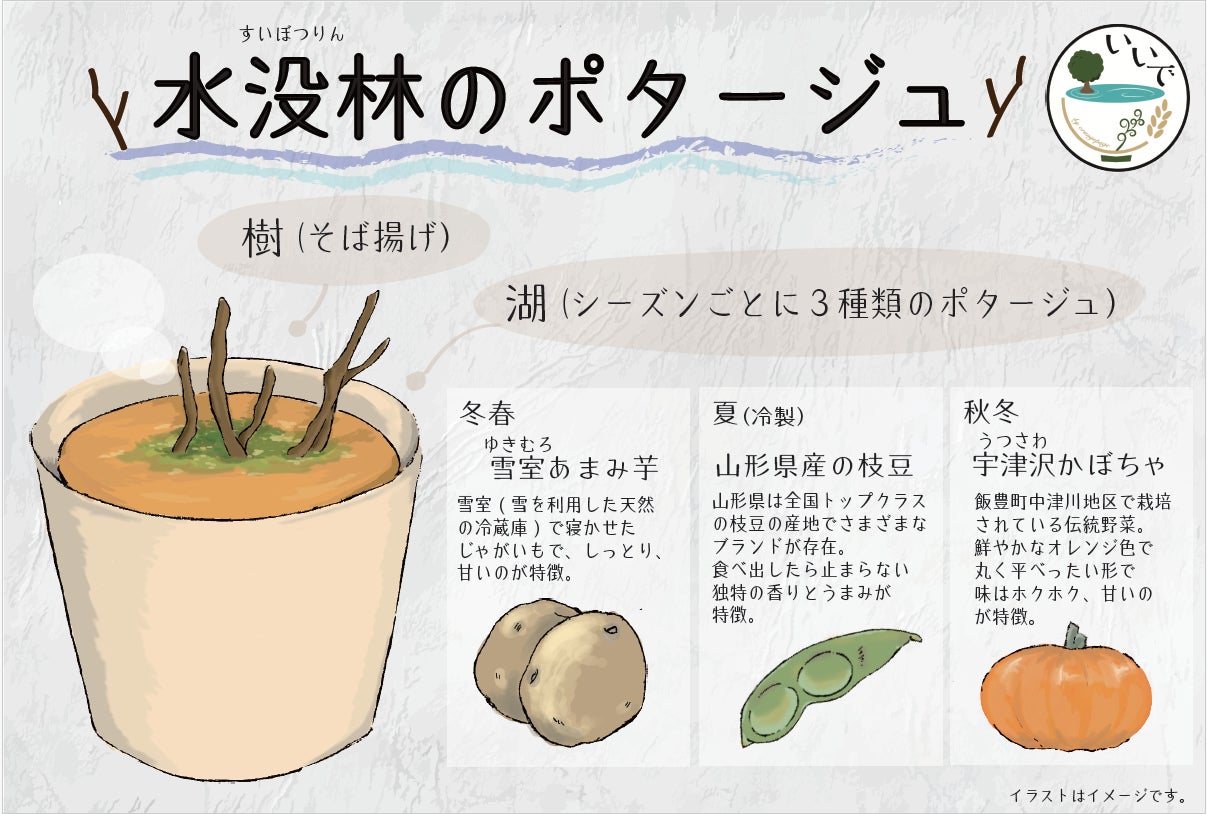 ・水没林のポタージュ:シーズンごとに異なる3種類のポタージュを水没林の湖面に見たてて販売します。