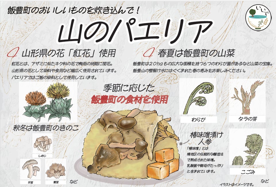 ・山のパエリア:キノコ、山菜など季節ごとの山の幸をふんだんに使い、色と香りづけは山形県の花「紅花」を使用したパエリアです。