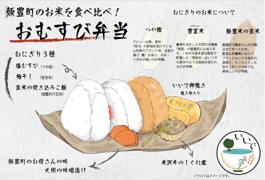 おむすび弁当:飯が豊かな町、飯豊町。飯豊町特産であるつや姫を中心に米のうまさを存分に活かした昔ながらのお弁当です。(予定価格 800円)