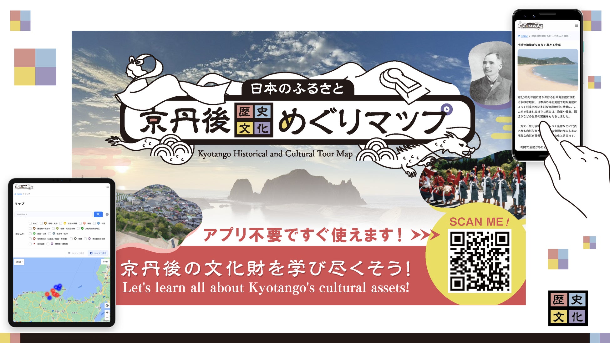 「京丹後歴史文化めぐりマップ」は、これら魅力的な歴史文化の特徴(ストーリー)を、市内外の多くの方々に知っていただくとともに周遊していただけるよう、スマートフォンやタブレットを使って自宅でも現地でも楽しむことができるものとして作成しました。