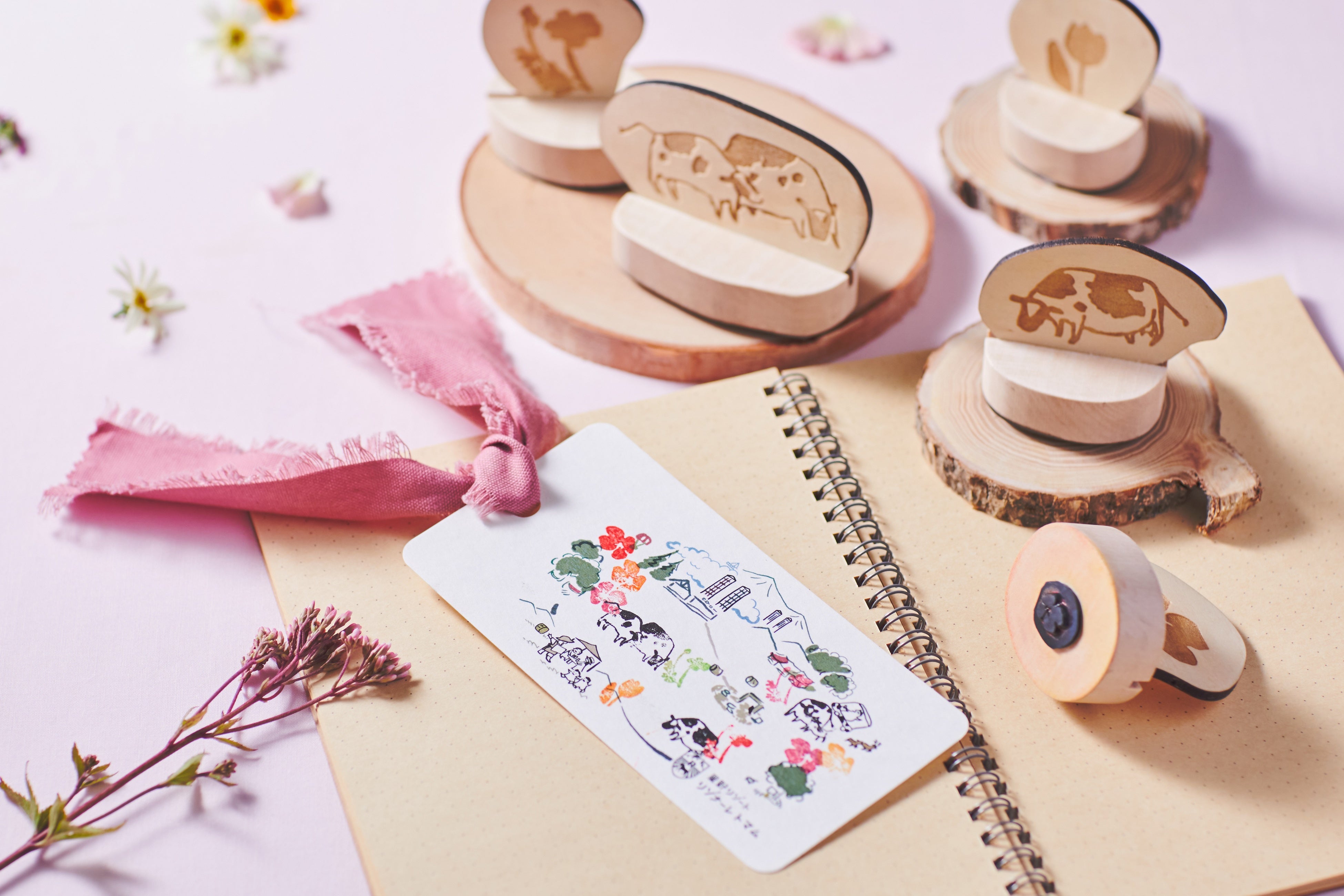 これは、ゲスト自ら花を植えて、水やりをし、花咲くファームガーデンの装飾をスタッフと一緒に創り上げる体験です。自分好みの色の花を選んでファームエリアを彩ります。また、花を植えるエリアの土には、ホテルから出た生ごみで作られた堆肥を使用。堆肥ができる過程や、ファーム星野の成り立ちを知りながら、実際に花植え体験ができます。さらに体験後は、ファームエリアが描かれたしおりに、そこで暮らす牛や、色とりどりの花のスタンプでデコレーションし、思い出を形にして持ち帰ることができます。