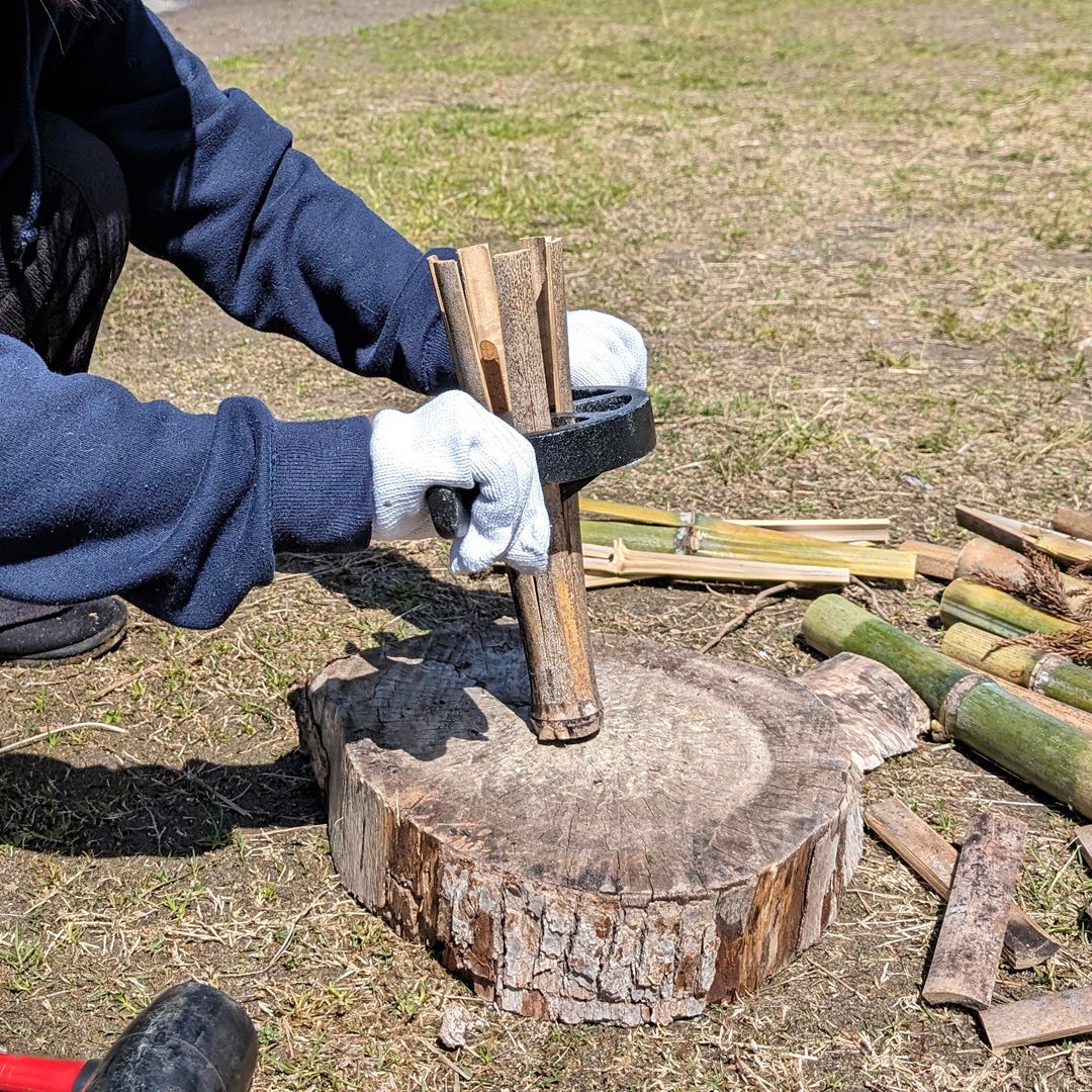 ③薪割りコーナーにてかまどにくべる薪づくり(竹割り)をします