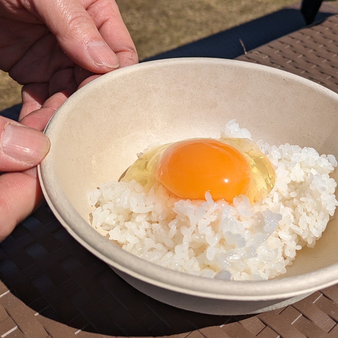 炊き上がった「羽釜炊きご飯」は、君津名産の新鮮な生たまごをかけて「たまごかけご飯」として召し上がっていただきます。たまごは1人「2個」つきます。君津(きみつ)の地名にあやかり、黄身が2個でキミツー、キミツの朝めしが完成します。