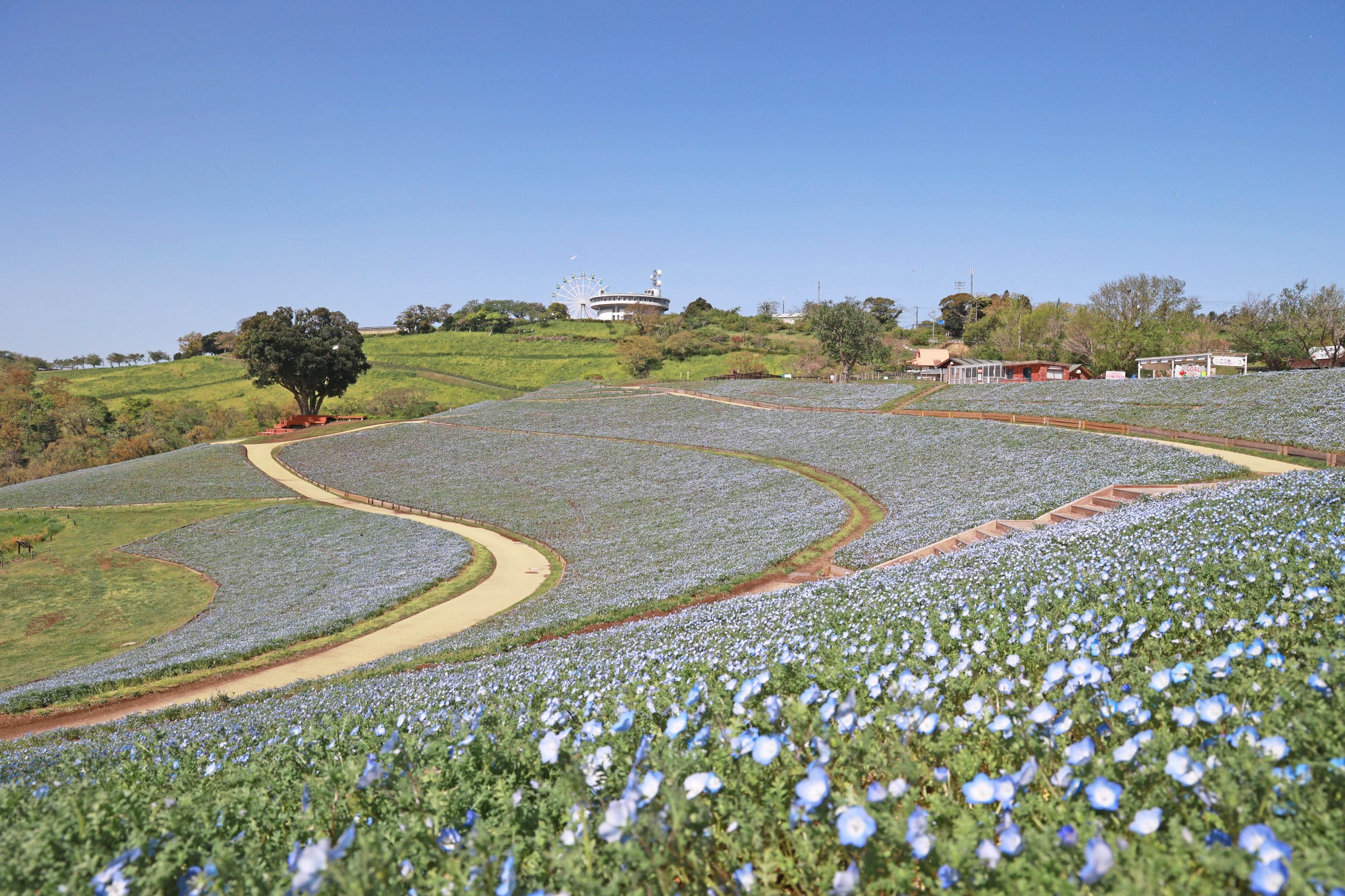 標高約300mに位置する山の上の牧場で、さえぎるものがない青空と一面を染めるネモフィラのとっても爽やかなコラボレーションをぜひお楽しみください!