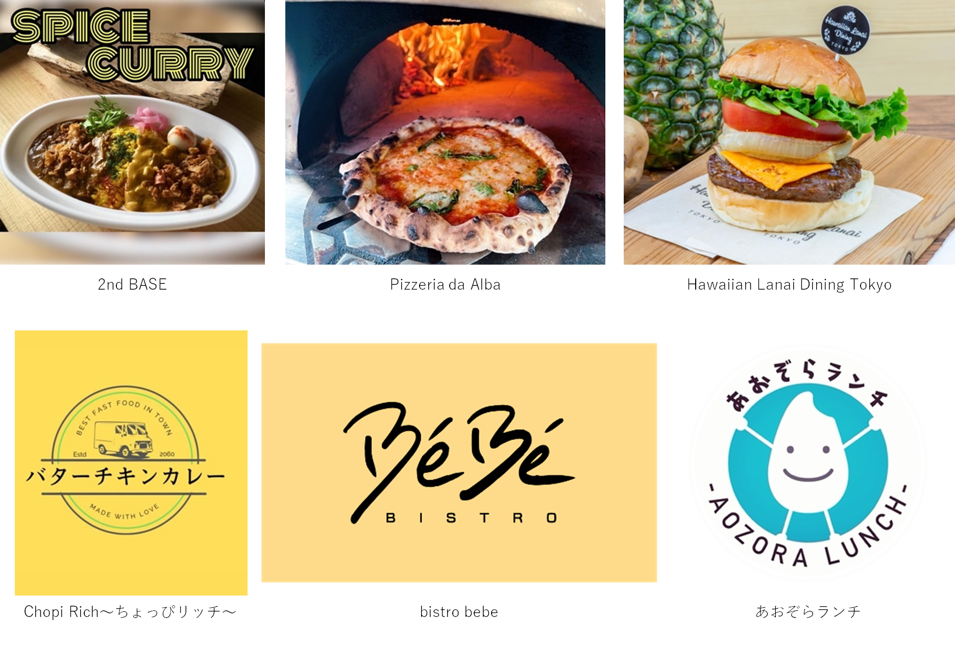 BLUE SIX COFFEE / Gelato 9. / timsum / bistro bebe / Erunoa / TORUKO Style / ⾁屋のまかない弁当やまと / うまいもんブラザーズ / REVEL / ワンダーディッシュ / ノムノムコーヒーアンドバレル / ⽯窯ベイクたらりか / こはく堂 / Hawaiian Lanai Dining Tokyo / THE SUMIBI Tokyo / Luxage / GoGoGo / 2nd BASE / kitchenぐりとふら / BUGRA / Pizzeria da Alba
