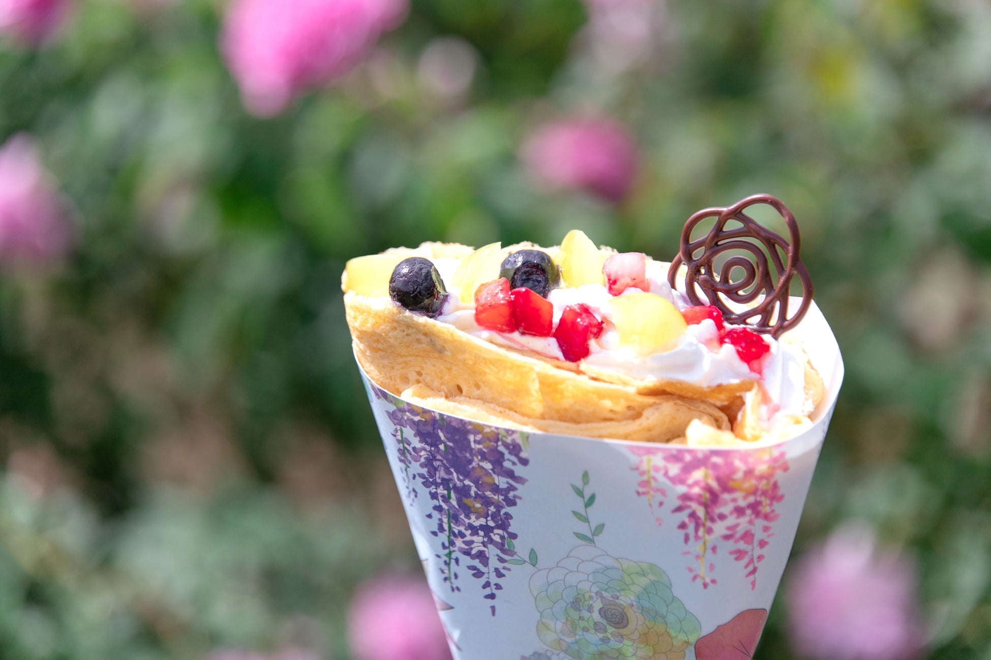 ジェラート工房ドナさんのモッツァレラチーズや、園内で採れたローズマリーを使った「花の森ピザ」が絶品。トッピングに世羅産はちみつ(別料金)をかけると甘じょっぱくてまた違った味わいになります。デザートには季節の果物を使用した「花の森クレープ」やスカット爽快な「ローズソーダ」がおすすめです。