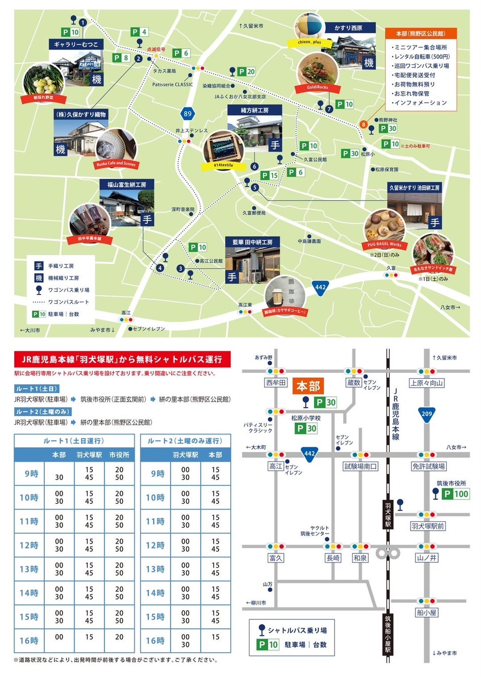 JR羽犬塚駅と実施本部を結ぶシャトルバス、各工房を巡る無料の巡回ワゴンを運行します。本部で貸出しの、レンタサイクルもぜひご利用ください(電動自転車あり・有料)