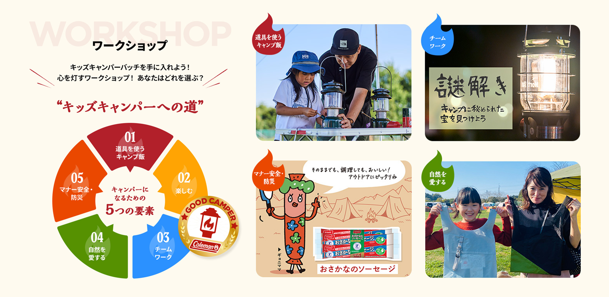 ワークショップに参加して、キッズキャンパーバッジを手に入れよう!キャンパーに不可欠な5つの要素「道具を使う・キャンプ飯/楽しむ/チームワーク/自然を愛する/マナー安全・防災」から4つ以上のワークショップをクリアしてスタンプを集めると「コールマンキッズキャンパー」に認定され、認定バッジがもらえます。ぜひご家族で挑戦してみてください。