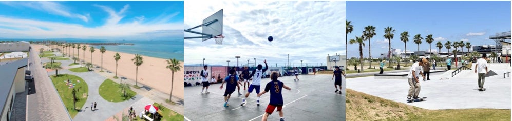 関西の玄関口である関西国際空港の対岸に位置する、関西最大級の交流・レクリエーションスポットです。高さ15.5mの高所アスレチックをはじめ、スケボーパーク・サッカーグラウンドなどのスポーツ施設を備えた『アクティビティエリア』や、ビーチをイメージしたBBQ場、テラス席の飲食店が並ぶ 『コミュニティエリア』、岡田浦漁港とのタイアップにより、泉州の自然の恵みをたくさん受けた、地元ならではの食材が楽しめる『マルシェエリア』、キーカラーが象徴的なヴィラが並び、キッチン、リビング、ジャグジー、BBQダイニングが用意されたお部屋でプライベートな時間を楽しめる『グランピングエリア』の4つのエリアに分かれており、一日を通してスポーツ・食・レジャーを丸ごとお楽しみいただけます。