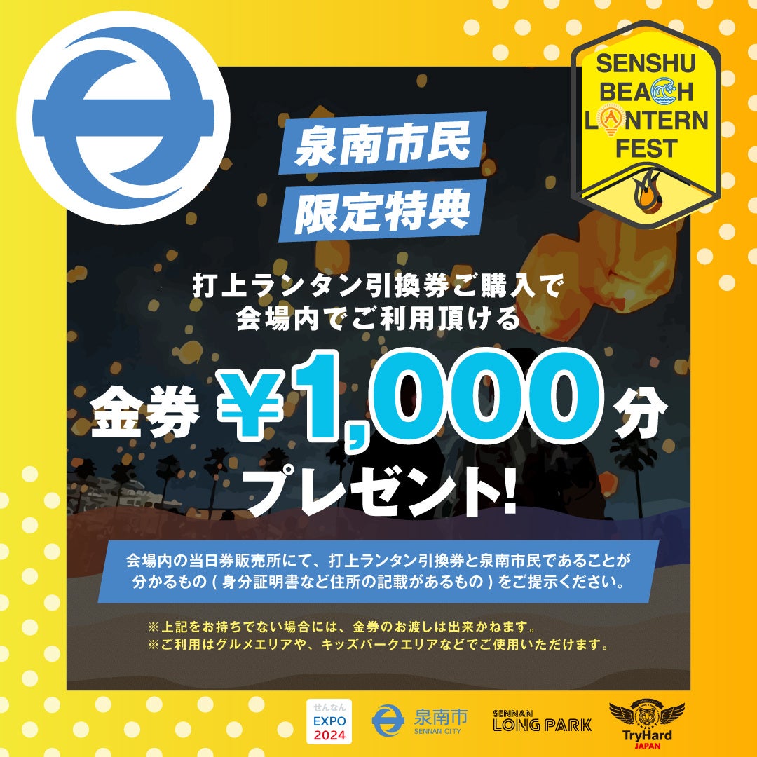 会場特典受付にて、ランタンご購入チケットと泉南市在住が分かるものをご提示頂けますと、会場内で使用できる金券1,000円分をプレゼントさせていただきます!