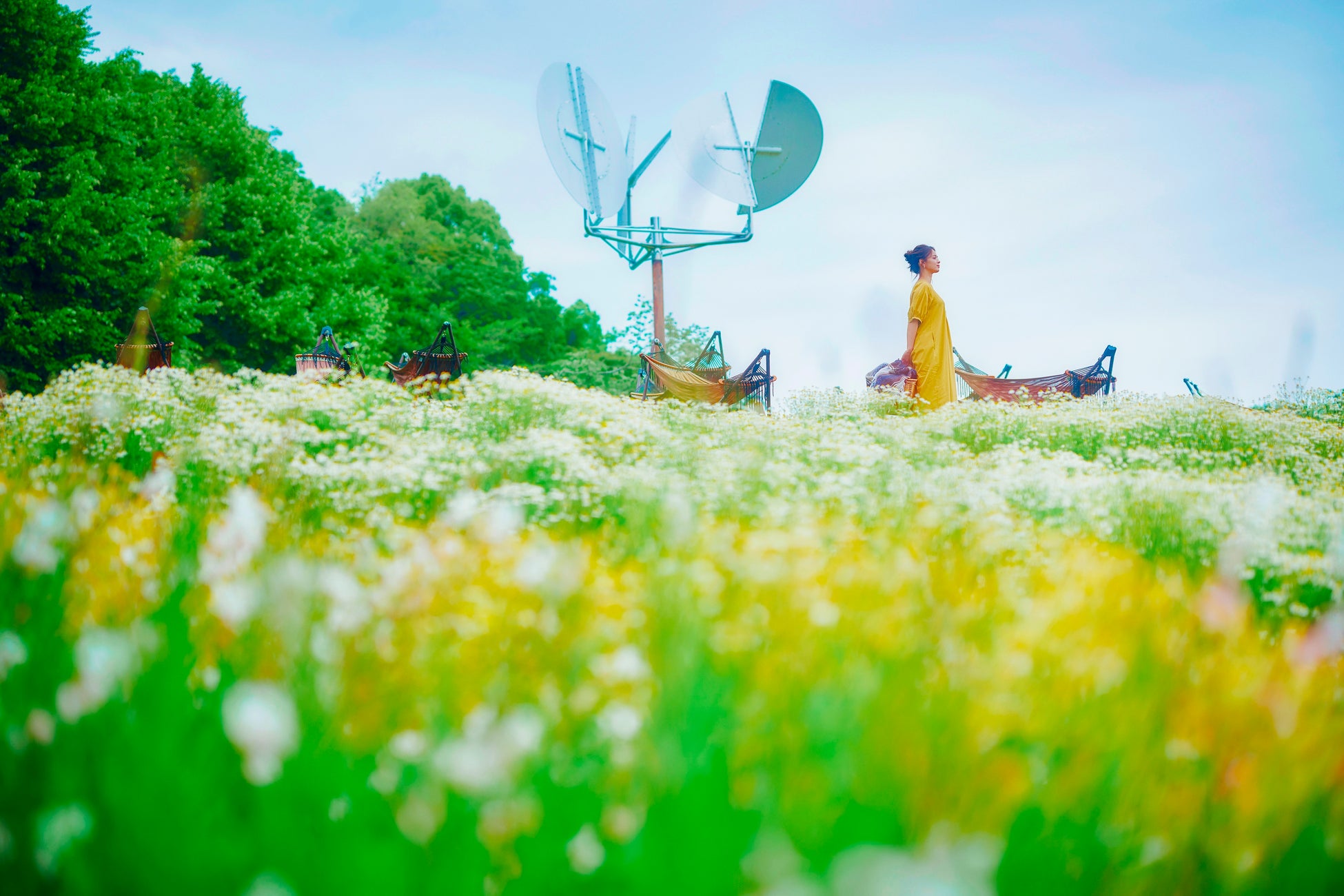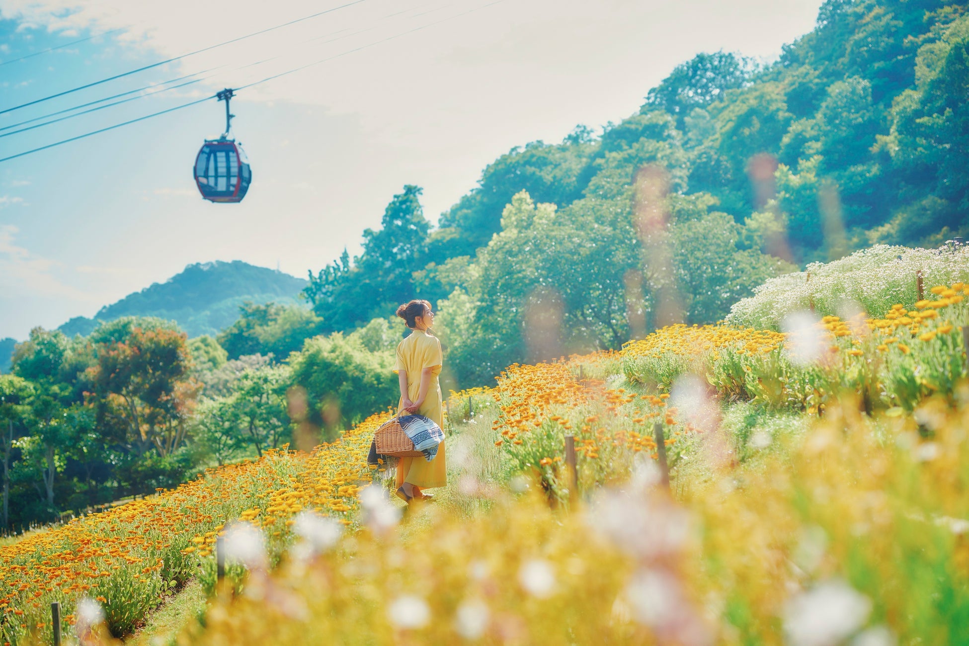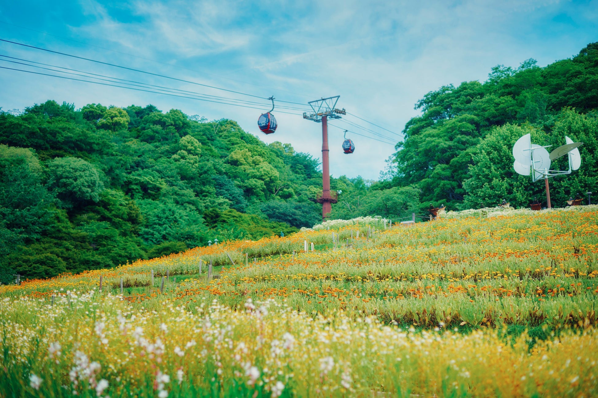 眼下には神戸の街並み。風の丘フラワー園一面を埋め尽くす、カモミールとポットマリーゴールド。日中は、真っ青な空の下で太陽の光を浴びた花々たちを。夕暮れ時には、夕陽を浴びた幻想的なお花畑に囲まれながら美しい写真が撮れるスポットでもあります