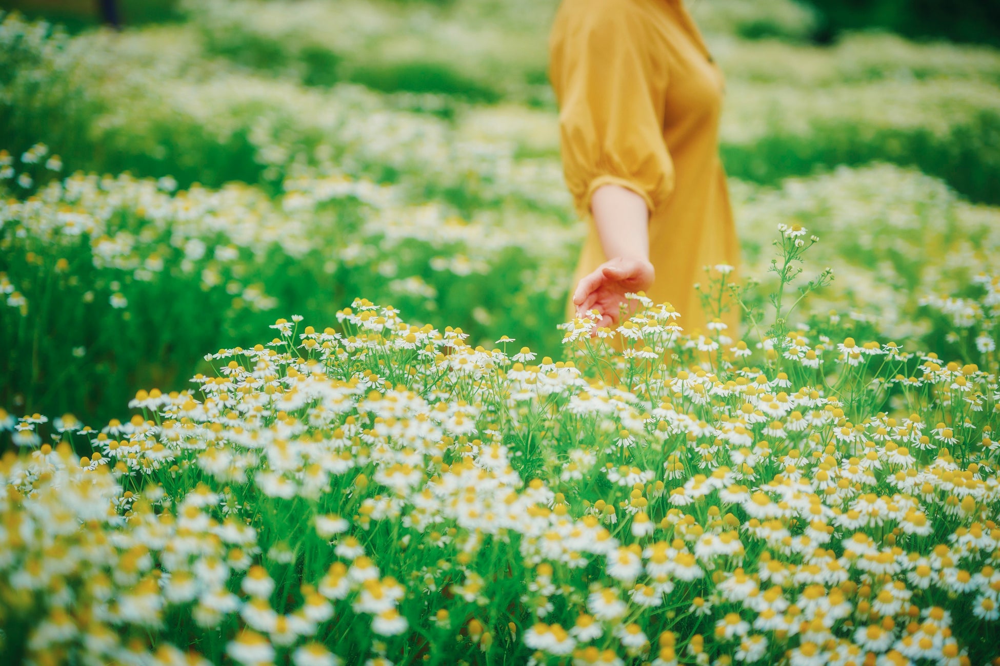 カモミールとポットマリーゴールドで埋め尽くされる「風の丘フラワー園」