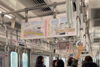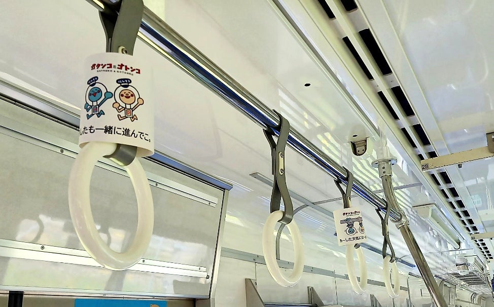 つり革には、「ガタンコとゴトンコ」のイラストと2人からのメッセージが記載されたアドストラップ(つり革広告)を掲出します。