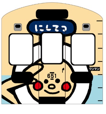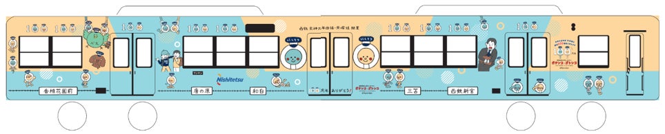 西鉄貝塚線を象徴する車体カラーのオキサイドイエローを活かしつつ、路線に面する海(博多湾・玄界灘)をイメージした水色を掛け合わせました。「ガタンコとゴトンコ」などパントビスコ氏のオリジナルキャラクターがデザインされており、窓の下には西鉄貝塚線の全10の駅名が並んでいます。また、ヘッド部分(車両前面)は、全面にガタンコとゴトンコをダイナミックに描いたインパクトのあるデザインに仕上げました。