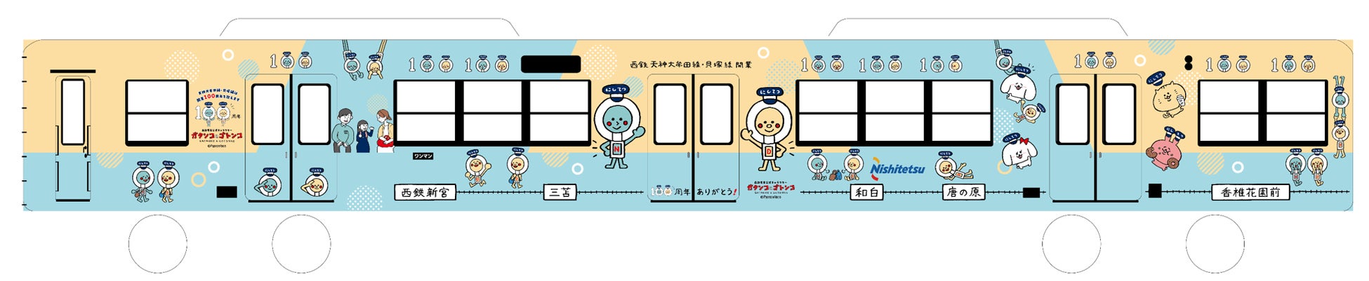 ラッピングデザインは、西鉄電車の開業100周年を機に誕生した公式キャラクター「ガタンコとゴトンコ」の生みの親であるクリエイター・パントビスコ氏が手がけました。西鉄貝塚線の象徴であるオキサイドイエローと沿線の博多湾や玄界灘をイメージした水色を掛け合わせた車体に、「ガタンコとゴトンコ」をはじめとしたパントビスコ氏のオリジナルキャラクターや西鉄貝塚線の全駅名がデザインされているほか、ヘッド部分はガタンコとゴトンコをダイナミックに描いたインパクトのあるデザインに仕上げました。