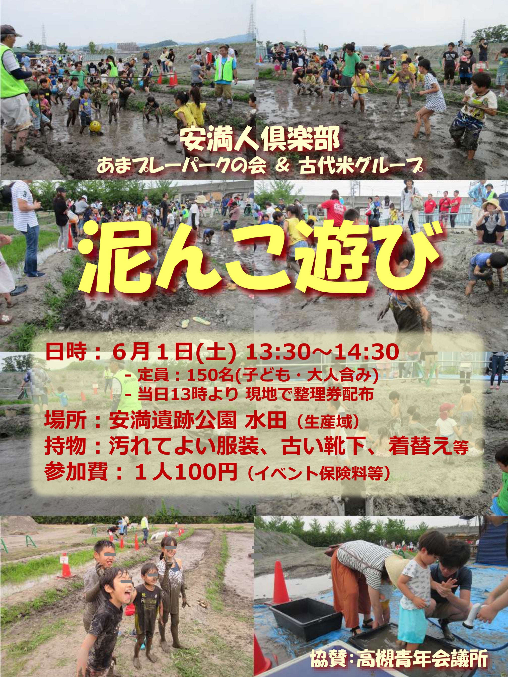 6月1日(土曜日)、安満遺跡公園で活動する市民団体「安満人倶楽部」が田んぼの中で泥だらけになって思い切り遊べるイベント「泥んこ遊び」を開催。同公園内にある田植え前の水田で、つな引きやドッジボールなどで自由に遊ぶことができます。