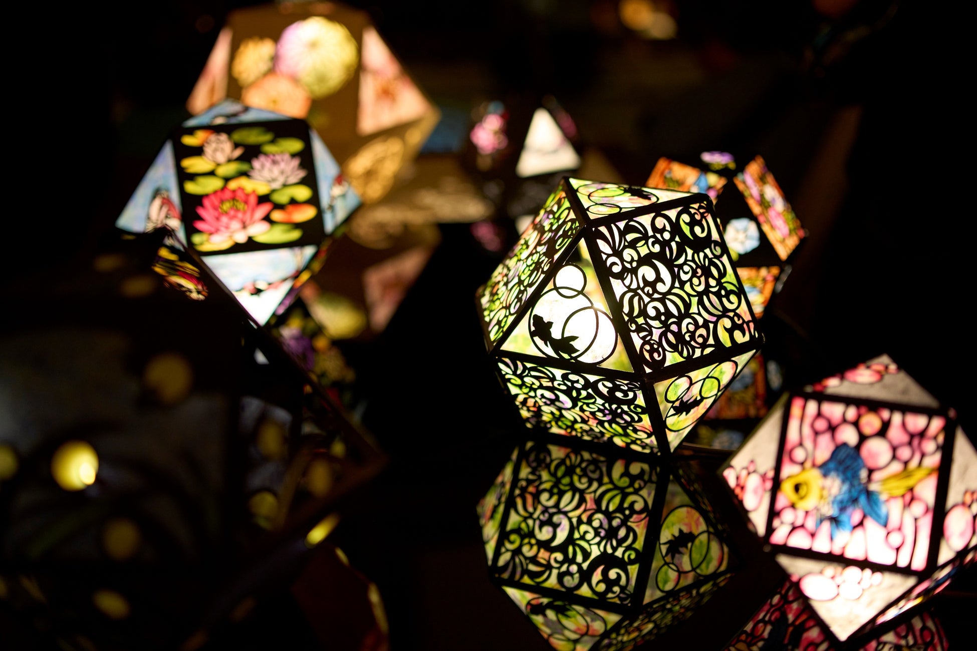 竹取物語、葛の葉伝説、天女の羽衣など、夢か現か、まるでおとぎばなしのような物語の扉が、階段をあがる度に開いていきます。類稀な文化財の空間に展開するアートイルミネーションともいえる作品に、音楽や香りが交わり妖しく美しい世界へいざなう演出が、夏のひとときを幻想的に彩り、五感を潤します。