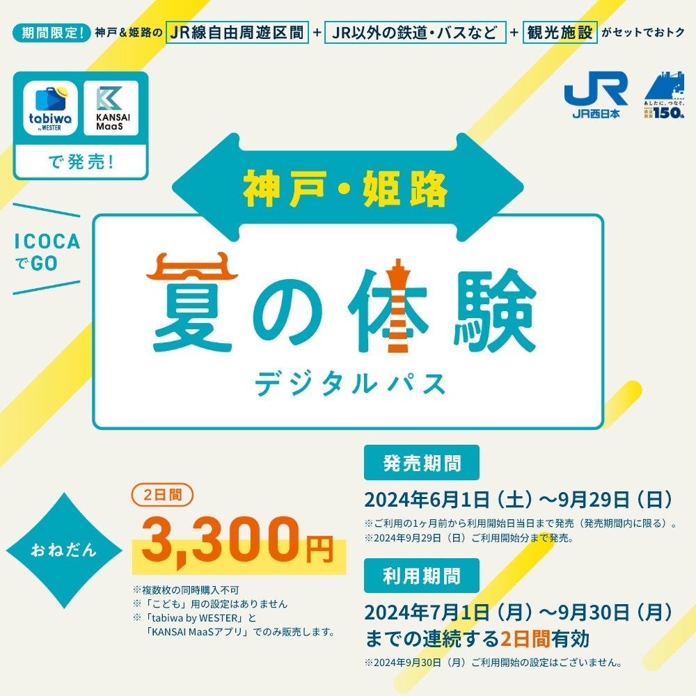 (ICOCAでGO)神戸・姫路 夏の体験デジタルパス(2日間用)は、「神戸ポートタワー」「姫路城」等の入場料をセットにして、こちらもJR自由周遊区間を新大阪までにして、3,300円で発売します。