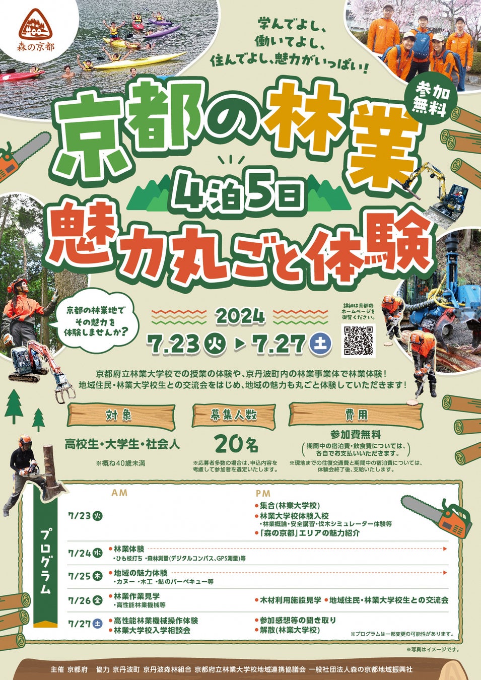 京都府では、府内の林業就業者を増やすため、林業に興味のある方に京都府立林業大学校、京都の林業現場及び地域の魅力を体感いただく4泊5日の体験会を初めて開催します。