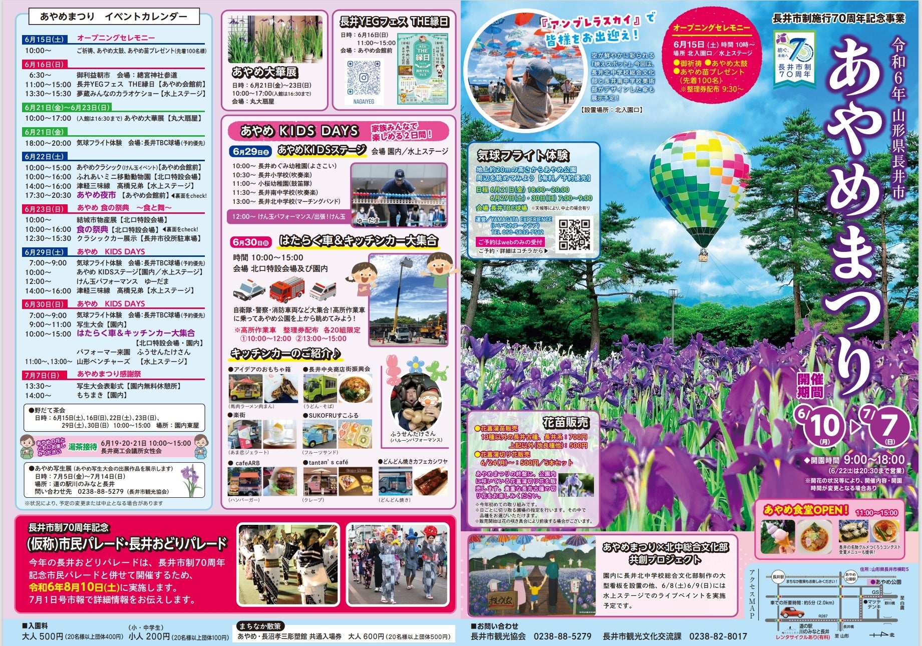 期間中はあやめの鑑賞だけでなく、気球フライト体験、ステージショー、はたらく車展示など大人から子どもまで楽しめる多彩なイベントがあります。