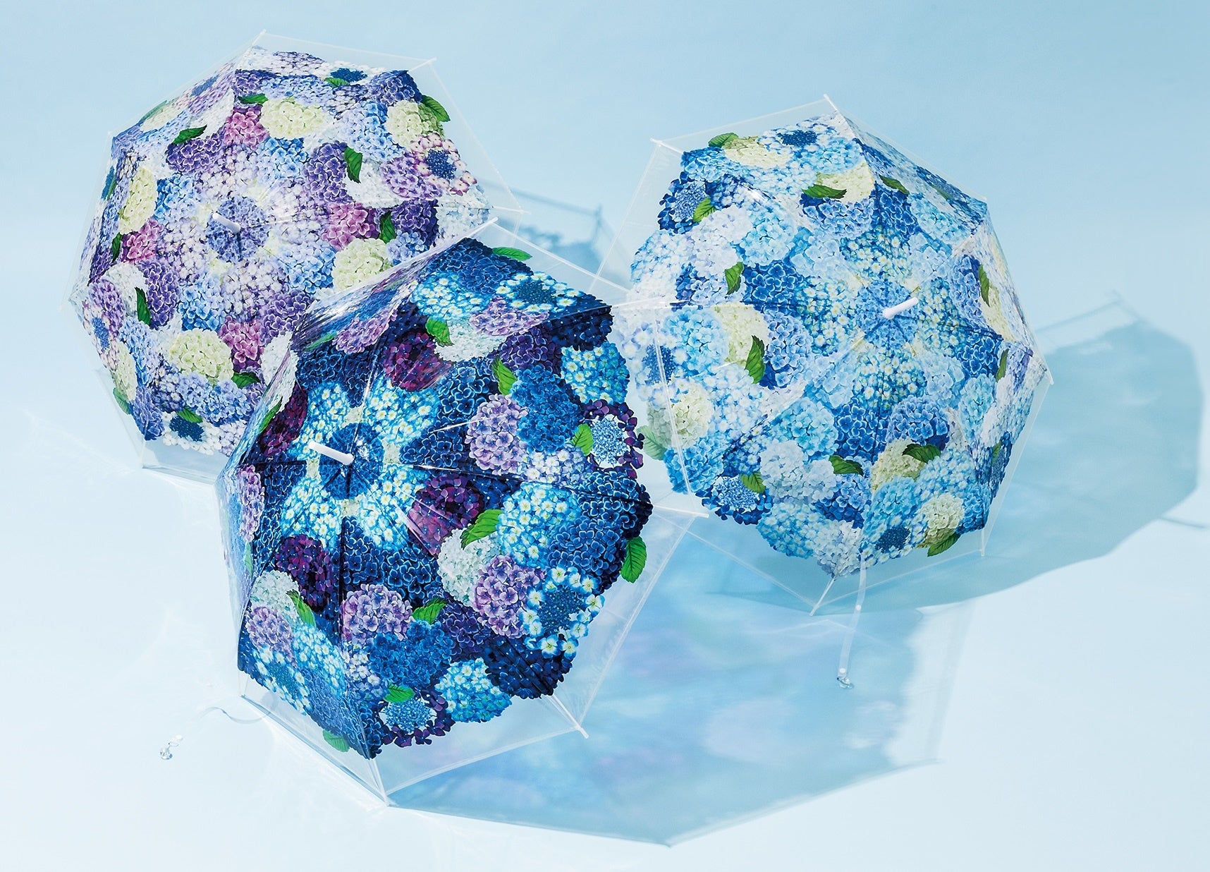 雨の日を美しいグラデーションで彩る紫陽花を、空いっぱいに広げて思う存分堪能できる傘です。繊細で、ていねいに描かれた紫陽花のリアルなイラストを透明傘にのせているので、外から見れば紫陽花の花束のよう。内側から見上げれば、まるで紫陽花が空から咲きこぼれてくるような気分が味わえます。