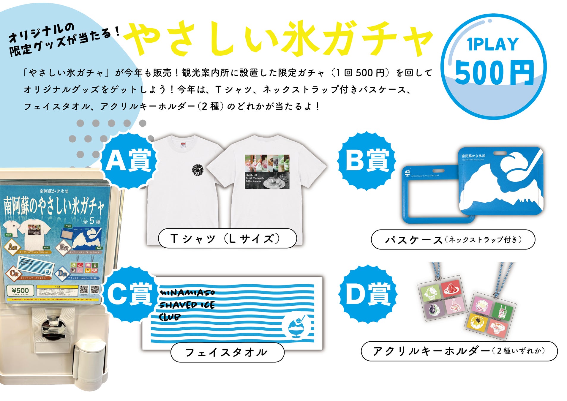 昨年大好評だった「やさしい氷ガチャ」が今年も販売!観光案内所に設置した限定ガチャ(1回500円)を回してオリジナルグッズをGETしよう!今年は、Tシャツ、ネックストラップ付きパスケース、フェイスタオル、アクリルキーホルダー(2種)のどれかが当たります。