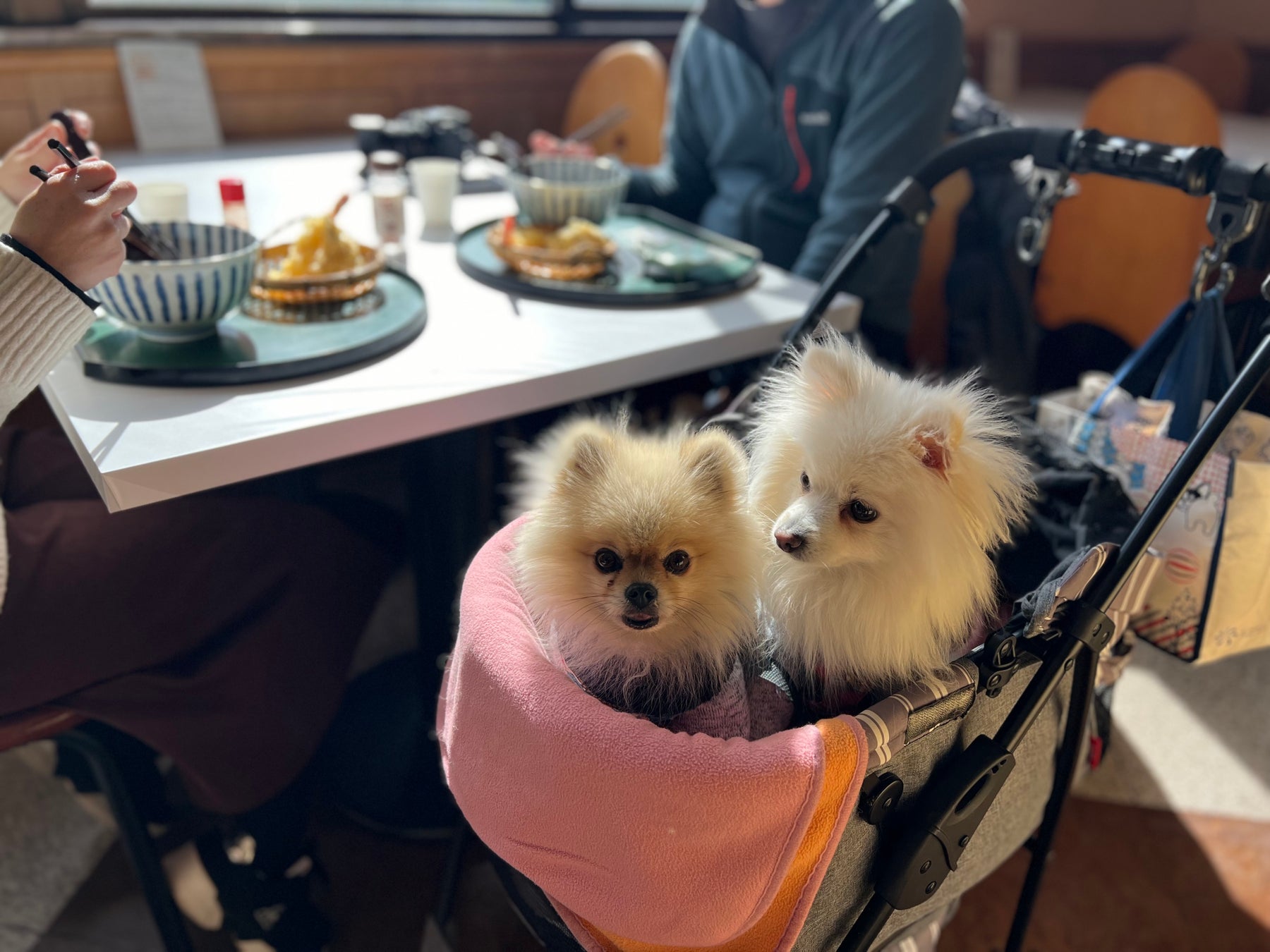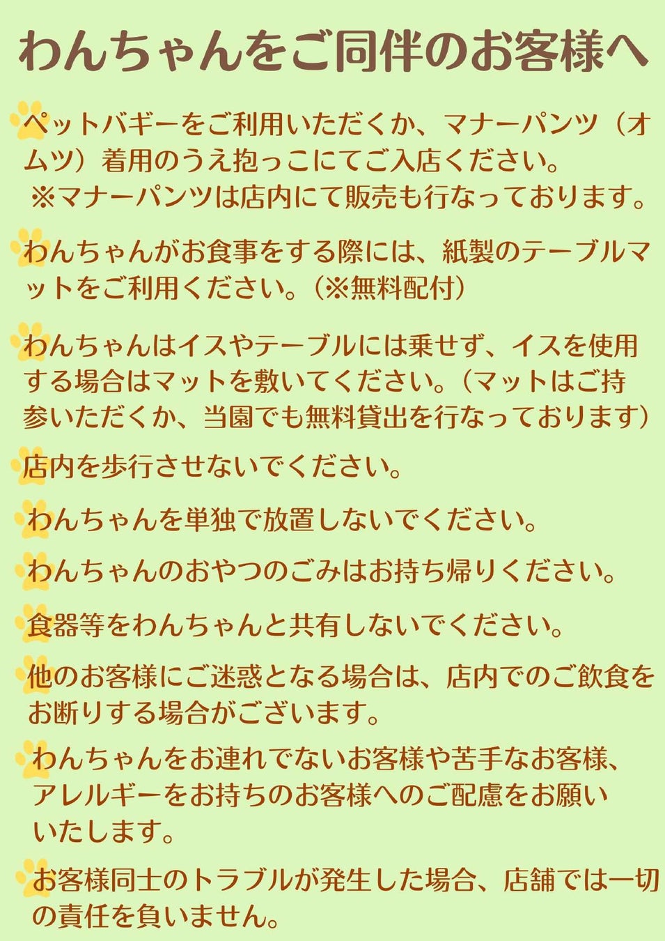 入店に際してはわんちゃんをお連れでないお客様もご利用になることから、ペットバギーをご使用いただくか、マナーパンツをご着用のうえ抱っこでのご入店をお願いしております。