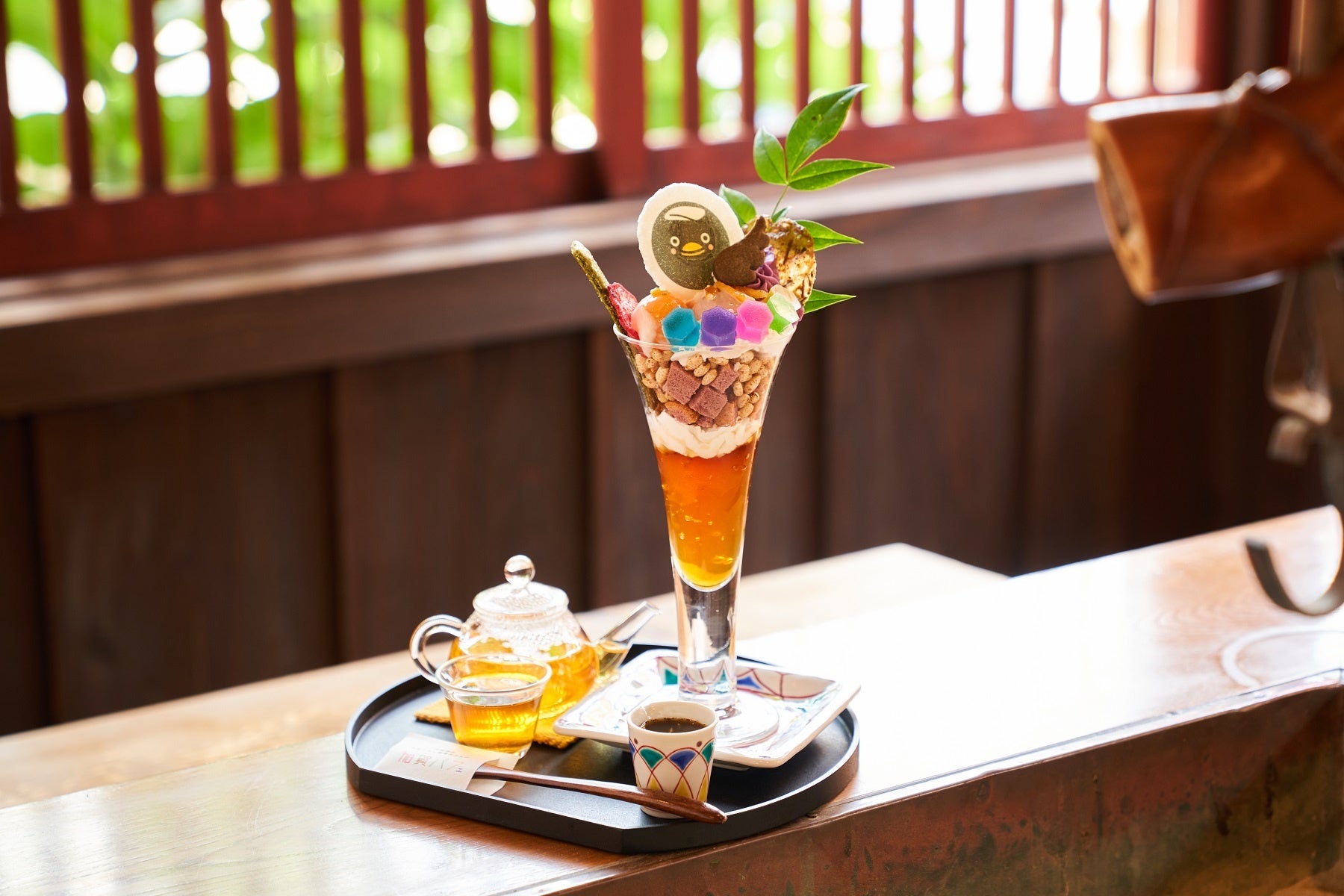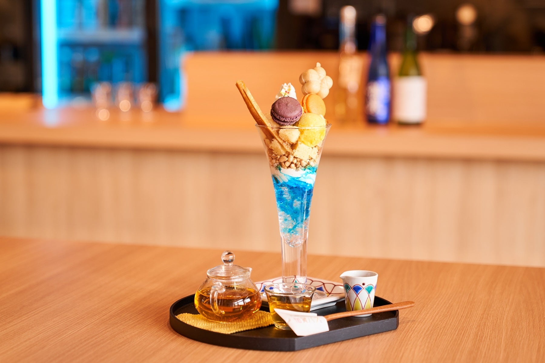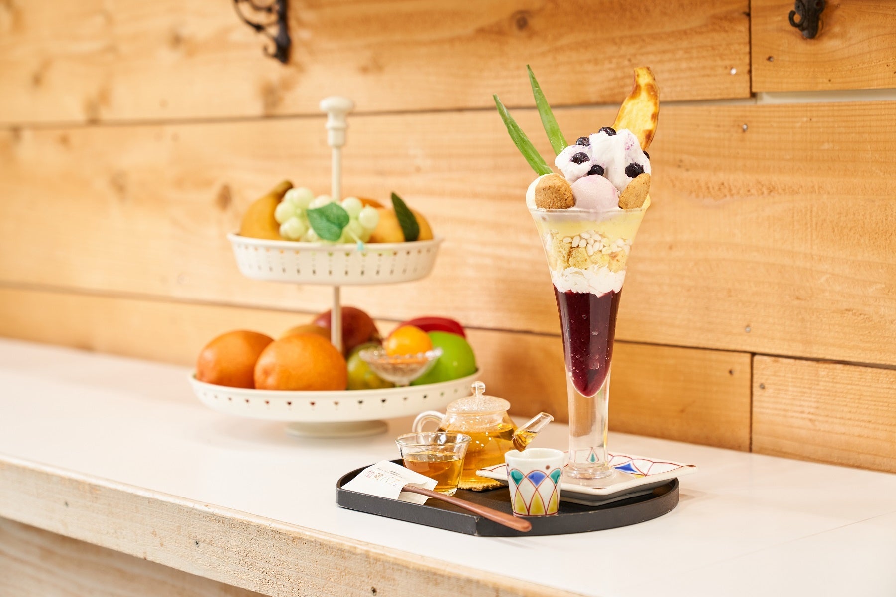 献上加賀棒茶付きで、「加賀パフェ」のために地元作家が新たに作り下ろした山中漆器(半月型お盆)と九谷焼(パフェグラス皿・ソースカップ)も使用しており、加賀市の魅力が凝縮された1品です。