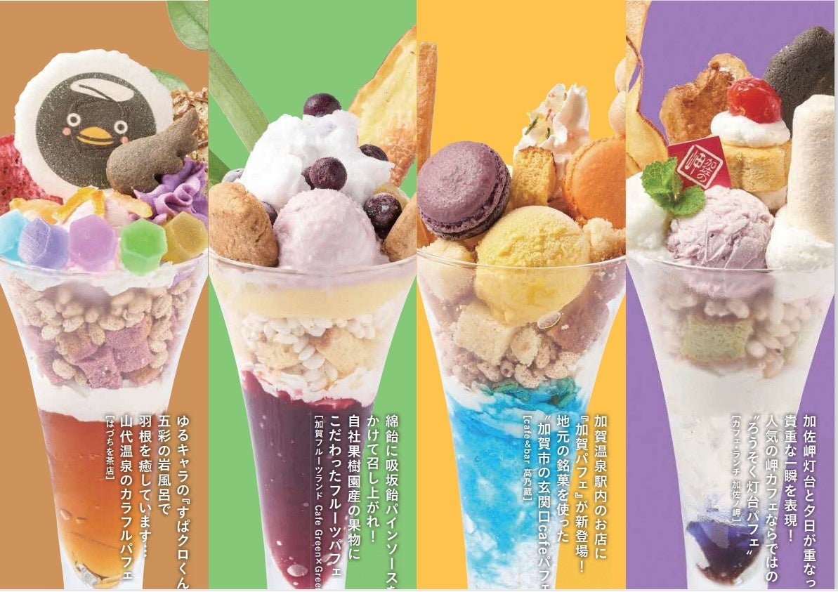 加賀九谷野菜トッピング・加賀ぶどうアイス・味平かぼちゃアイス・温泉卵・ポン菓子・野菜スポンジケーキ・はちみつ生クリーム・色鮮やかなゼリー・名物菓子「吸坂飴」オリジナルソース等をつかった、各店のこだわりのオリジナルパフェです。