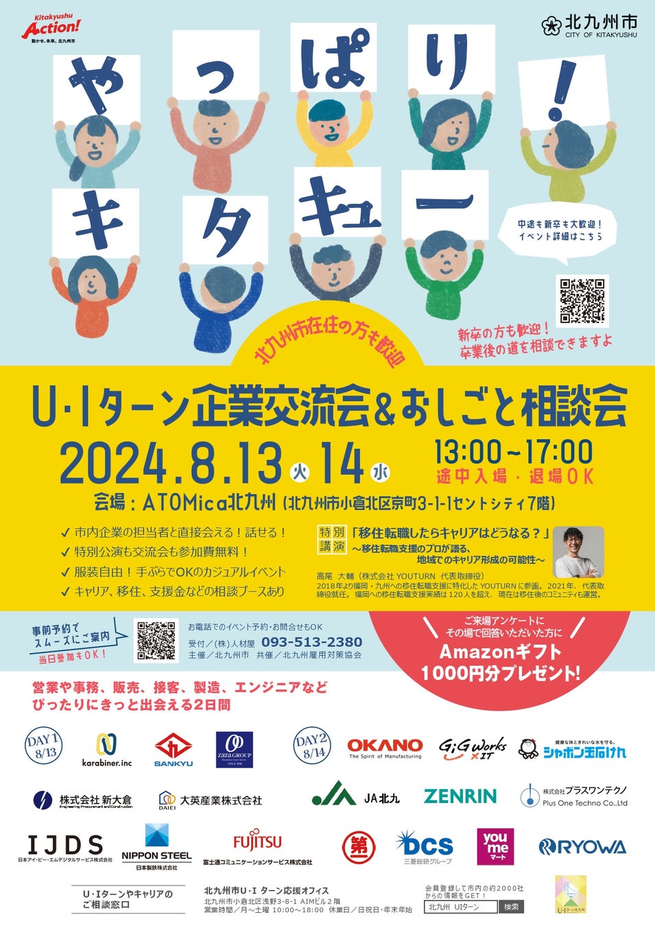 【8月8日申込期限】お盆の帰省時期に合わせて、北九州の市内企業との交流会とおしごとに関する相談会!2024年8月13・14日 「U・Iターン企業交流会&おしごと相談会」開催!