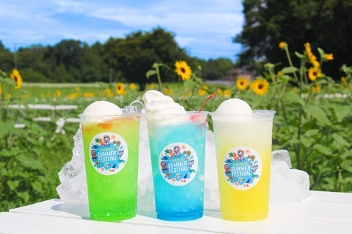 8月1日から「YUMEBOKU SUMMER FESTIVAL」限定の見た目も味も爽やかなドリンクを3種販売しております。牧場の夏をイメージした緑、青、黄の3色のカラーで商品開発しました。クラッシュした氷やしゅわしゅわ弾けるサイダーがベースになっており、酪農歴137年の牧場が作るソフトクリームやミルクジェラートを上にトッピングしています。大容量で約500ml入っているため飲みごたえもバッチリです。