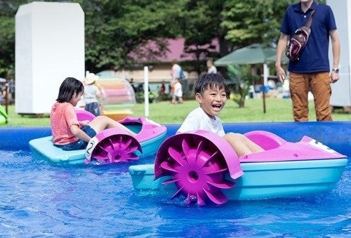 普段は、ピクニックやボール遊びなど多目的に利用可能な芝生スペース「エーカー広場」ですが、この夏は、水遊びができるプレイグラウンドに変身いたします。牛乳パック型のスプリンクラーや、夏らしい虹の散水バルーン、水が降り注ぐトランポリンなどもご用意しております。全身ずぶ濡れで飛び跳ねてください。