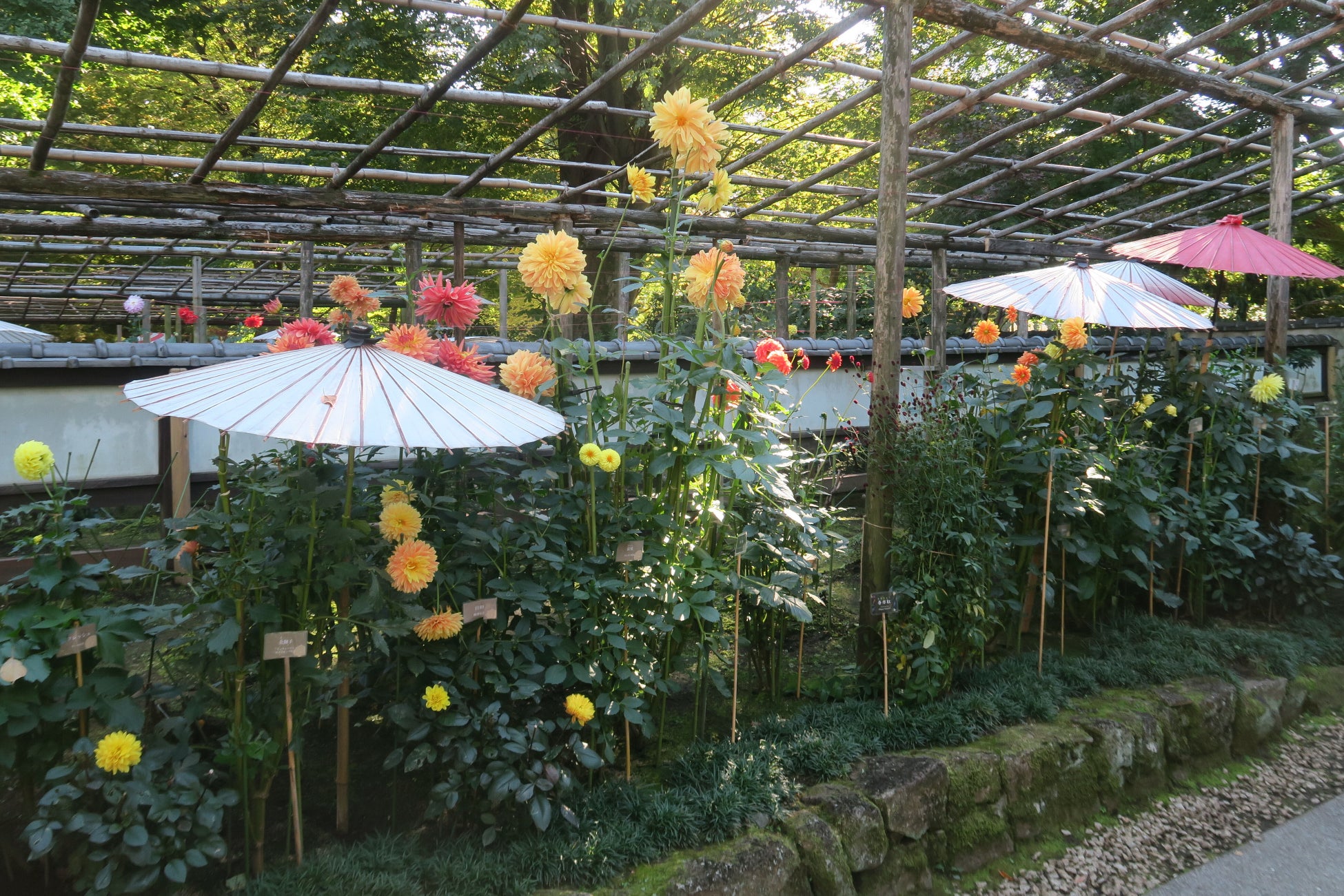 苑内では旧寛永寺五重塔や東照宮の参道に並ぶ石灯籠とあわせた江戸風情の中、和傘を庇にして咲くダリアを楽しめます。