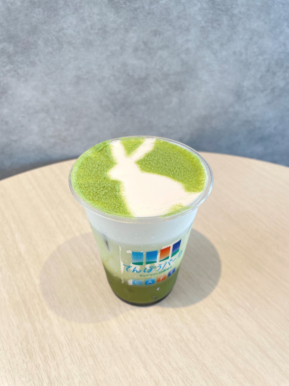てんぼうパーク内の「てんぼうの丘」の芝生をイメージした抹茶の上に大きなうさぎのシルエットが浮かび、中には黒みつとわらび餅が入った味も見た目も楽しめる抹茶ラテです。