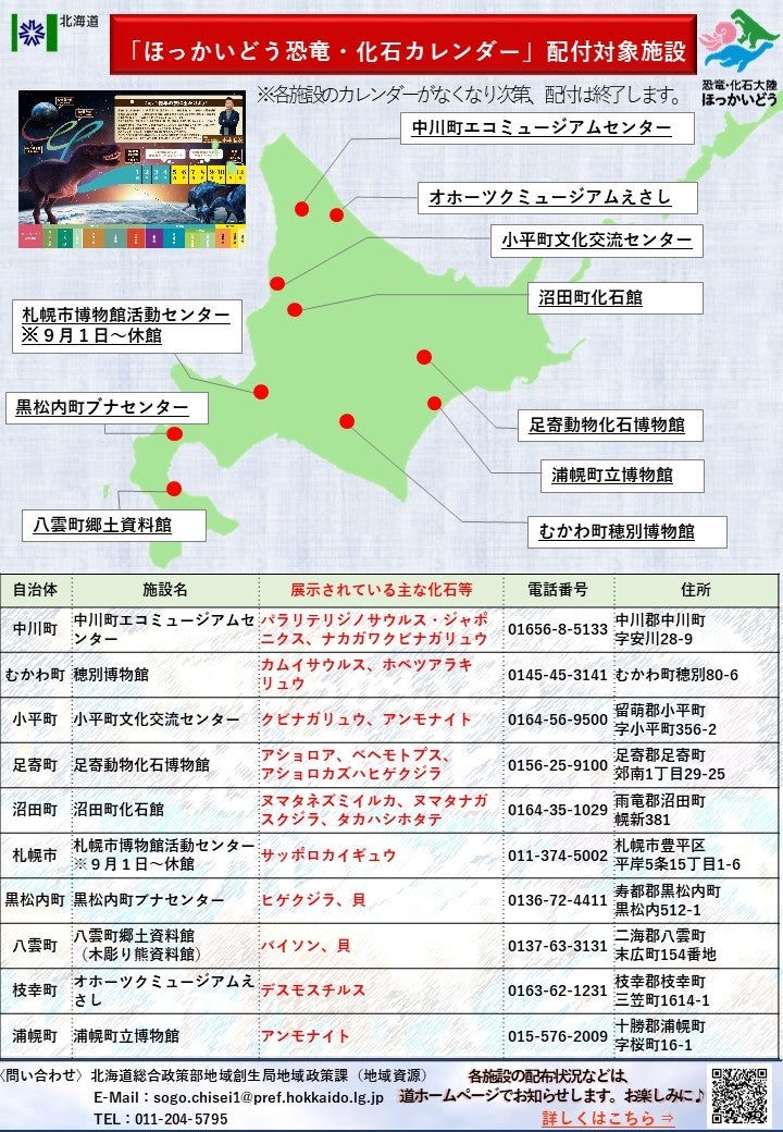 「ほっかいどう恐竜・化石カレンダー」配付対象施設にてプレゼント。(全10施設)