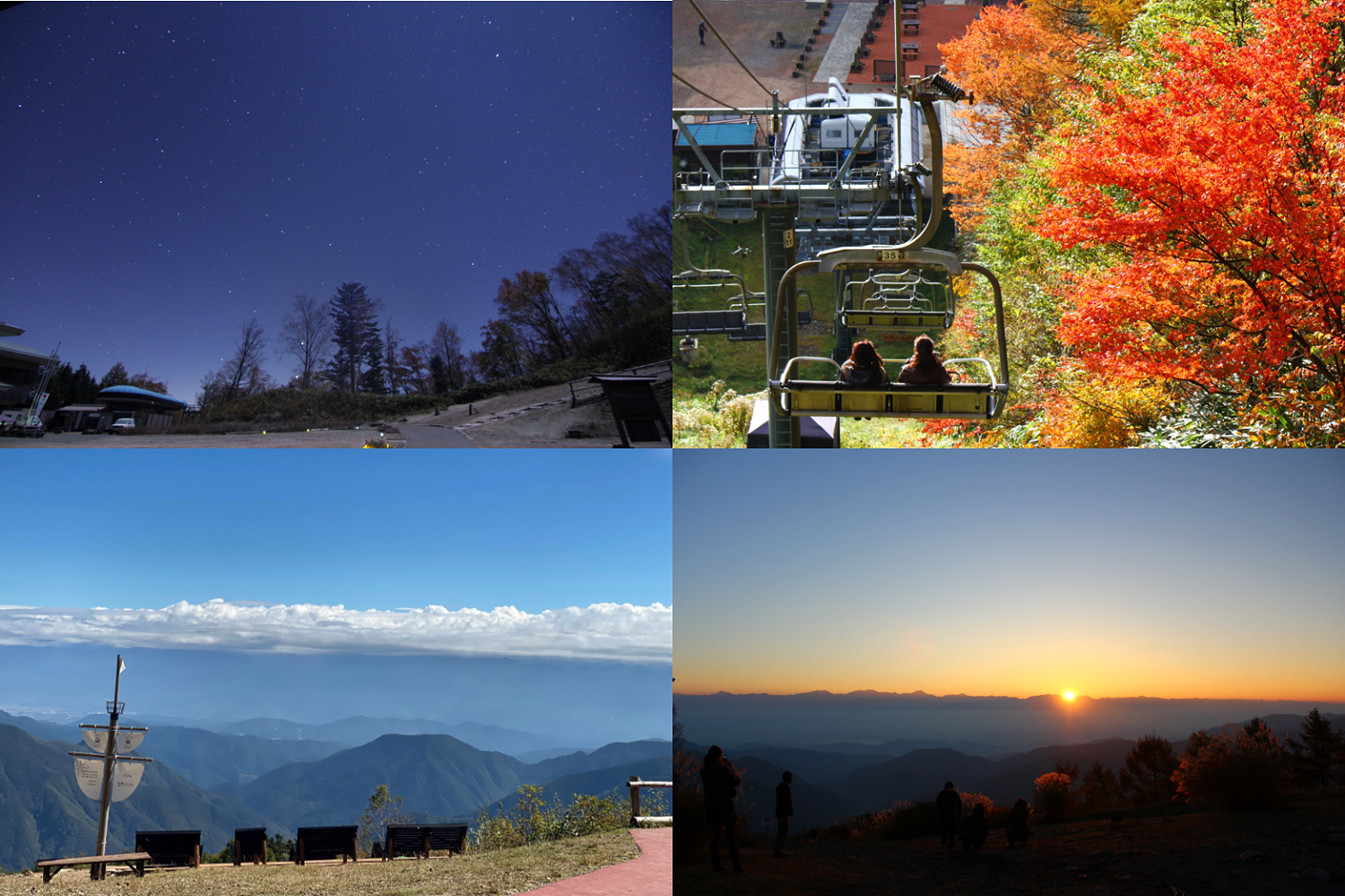 環境省が実施する全国星空継続観察で「星の観察に適していた場所」の第一位(平成18年)にも選ばれた満天の星を、晴れた日にはご覧いただけます。 星が瞬く静寂の夜から、暖かな光が辺り一面を包み込む朝へと移りかわる姿、10月から山々を紅く 染める紅葉、11月には南アルプスの冠雪。多くの感動の瞬間に出会える特別営業となっています。