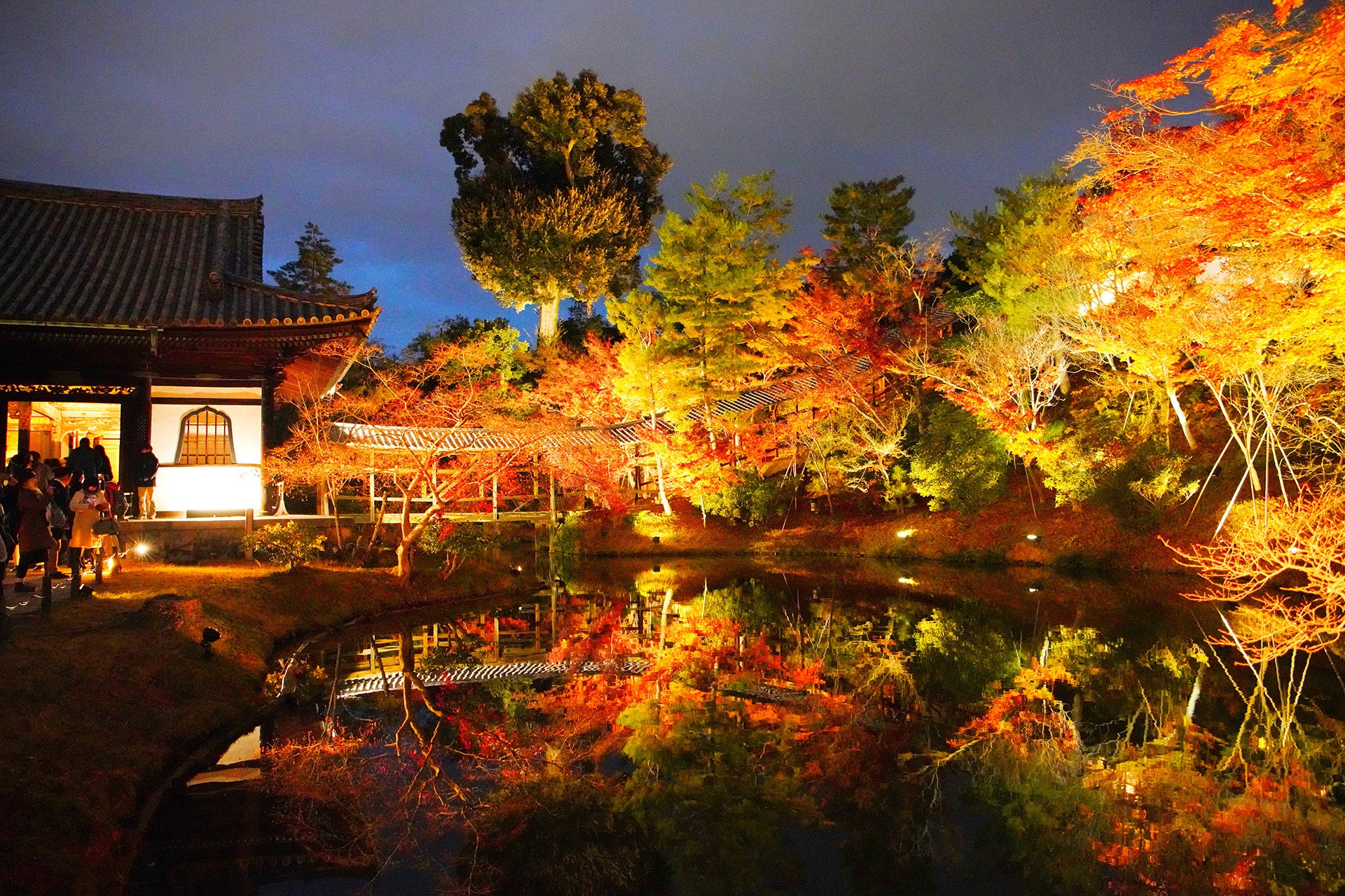 秋の夜間特別拝観では高台寺、史跡名勝の「高台寺庭園」を秀吉の辞世の句「夢のまた夢」をうけて暖かい照度で、幽玄の世界を現出させます。境内はさらに、臥龍池の水鏡の美しさとその周辺の紅葉、また竹林・偃月池周辺の松などを照 らし、自然の中に幻想さをかもしだします。