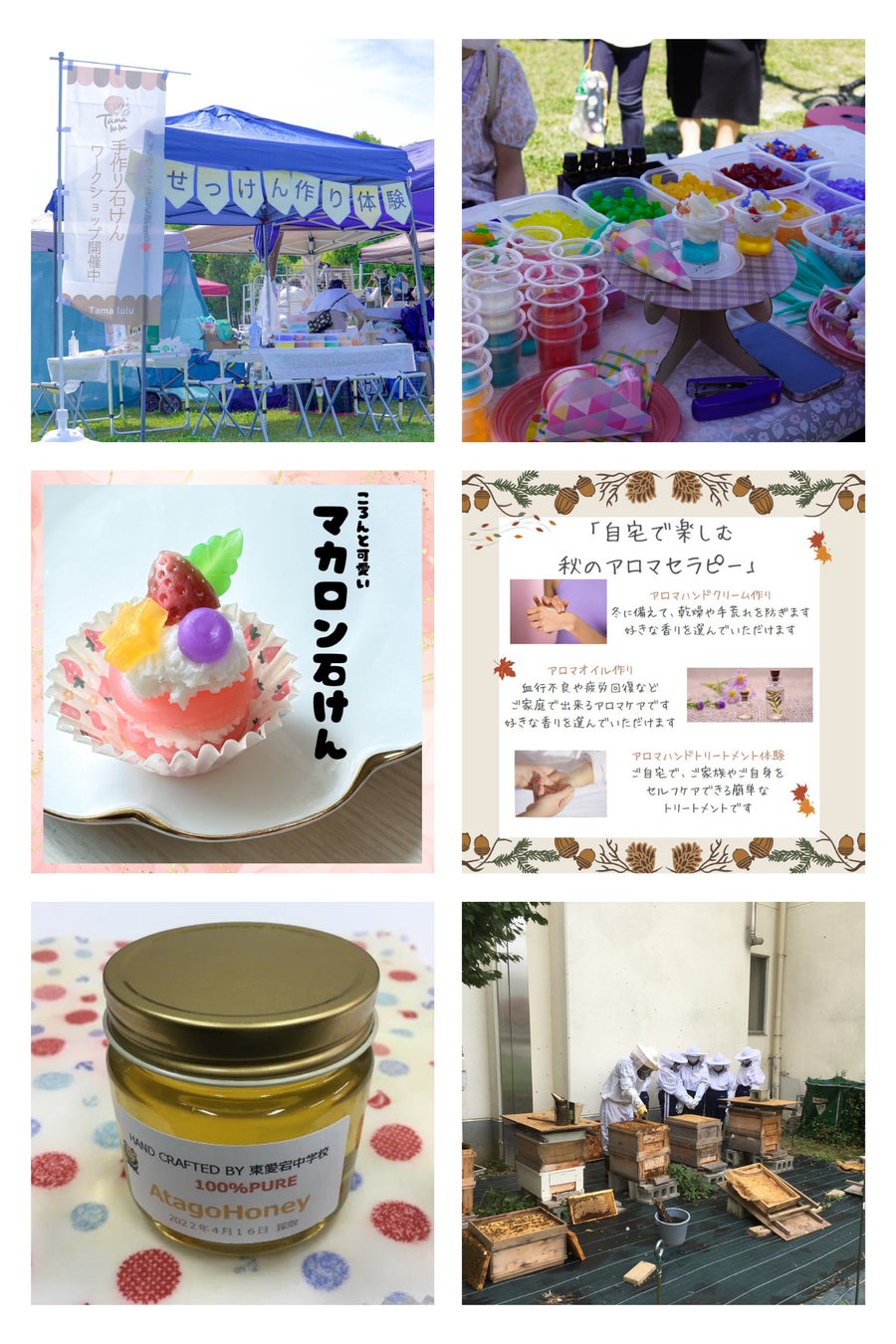 販売品目:グリセリンソープを用いた、固形石けん作り体験です。コロナ禍より手洗い促進運動として、お子様が自分で石けんを作り使いたくなワークショップを提供しています。