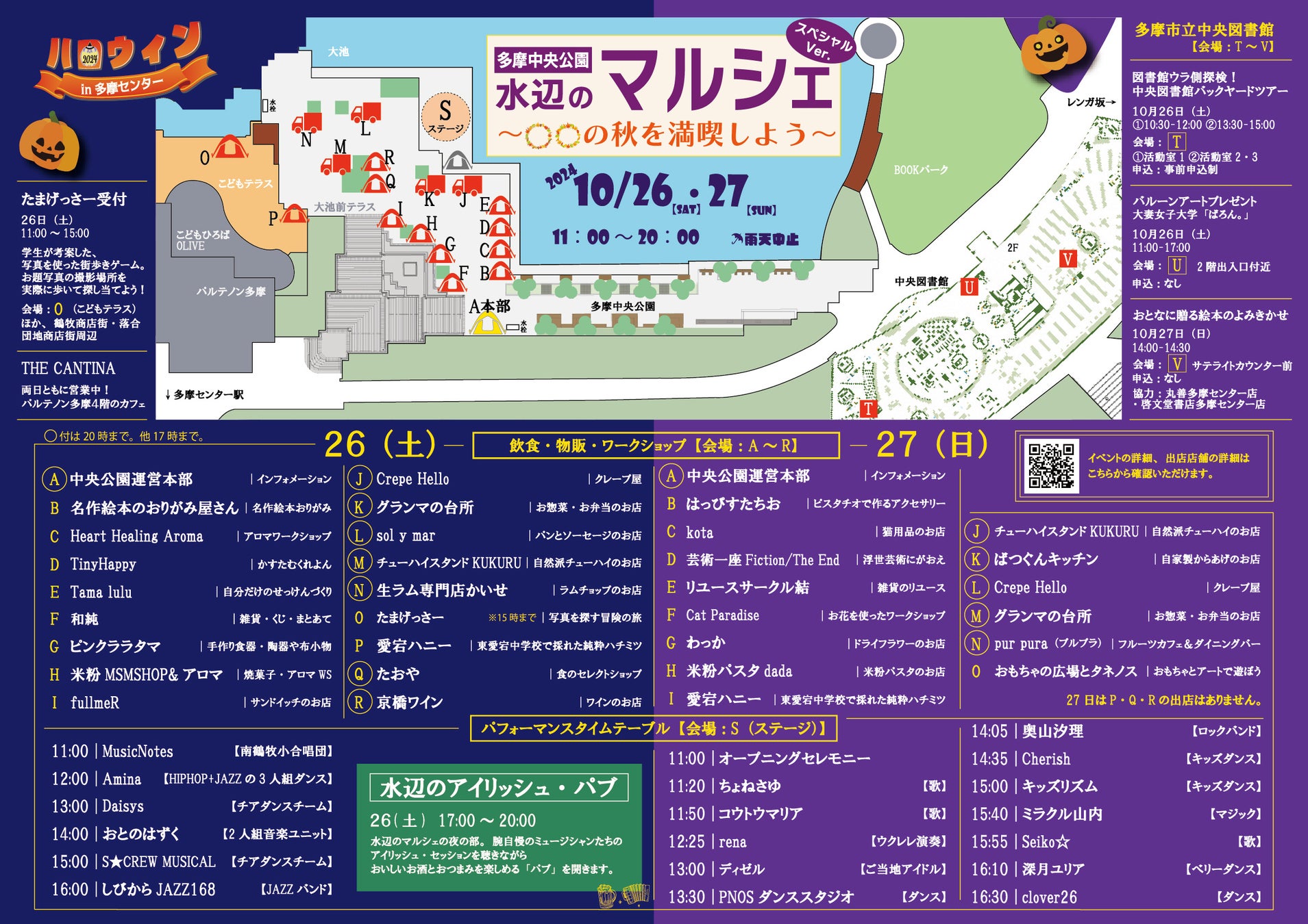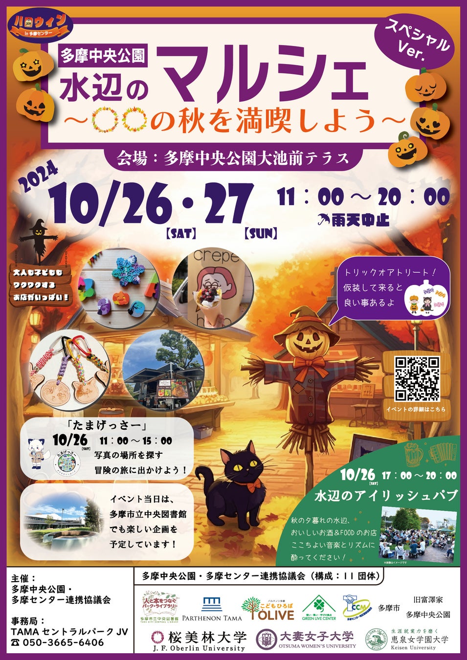 この度、10月26日(土)・27日(日)に、ハロウィンin多摩センターの開催に合わせて、規模を拡大した「水辺のマルシェスペシャル~〇〇の秋を満喫しよう~」を開催いたします。