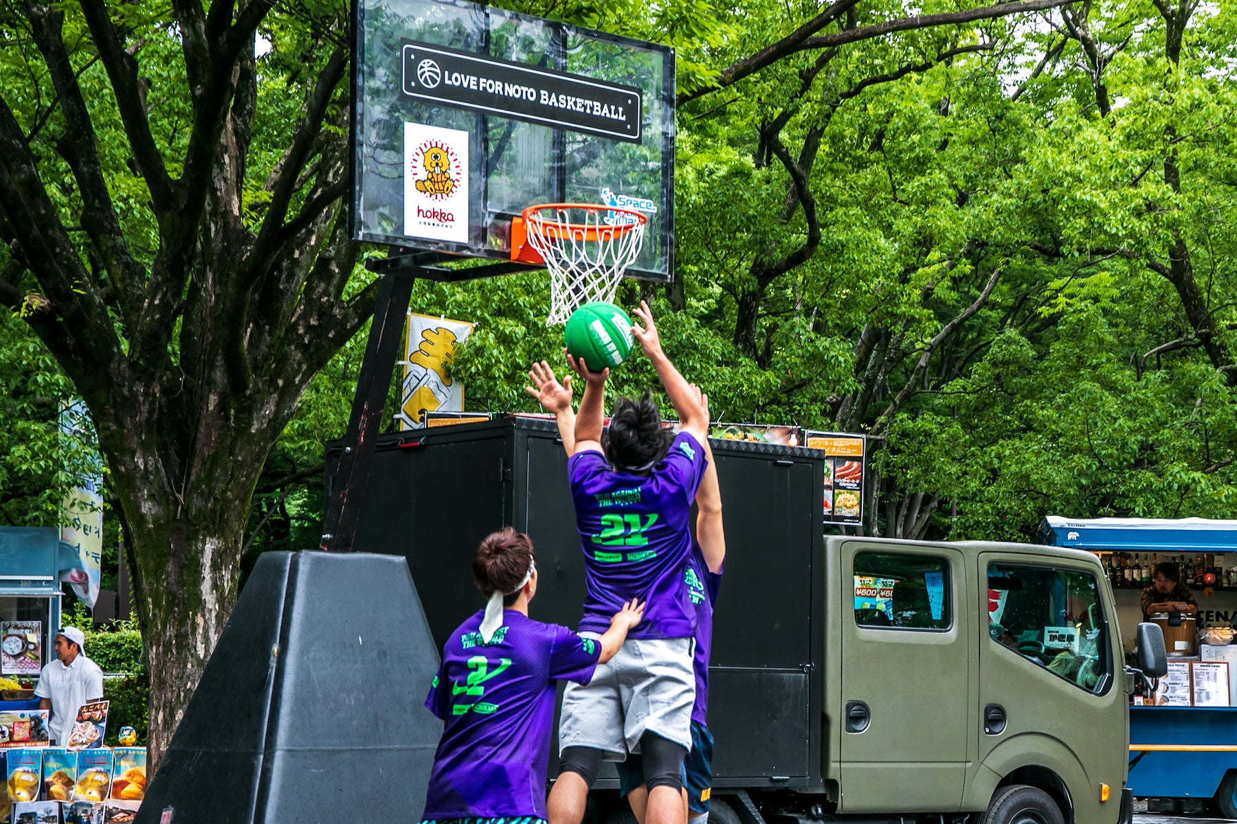 能登高校に練習着やユニフォームを提供いただいた、日本と世界のバスケットボールやストリートボールを繋げる活動をしている「SpaceBall Mag」による特設ゴールが会場に登場!