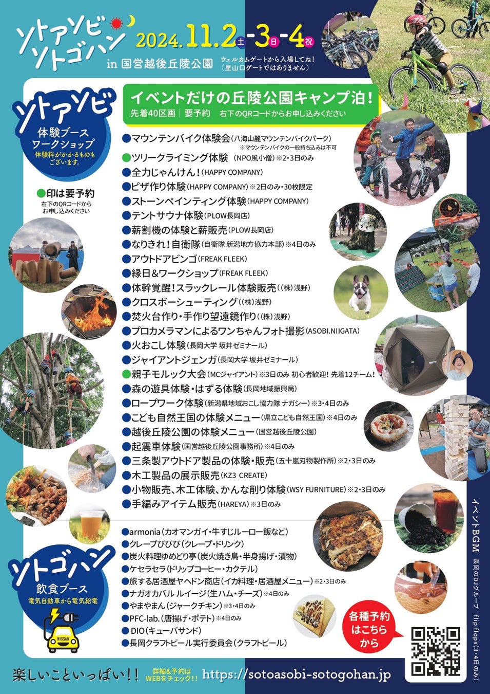 ●マウンテンバイク体験会(八海山麓マウンテンバイクパーク) ●ツリークライミング体験 (NPO風小僧)※2・3日のみ ●全力じゃんけん!(HAPPY COMPANY) ●ピザ作り体験(HAPPY COMPANY)※2日のみ・30枚限定 ●ストーンペインティング体験(HAPPY COMPANY) ●テントサウナ体験(PLOW長岡店) ●薪割機の体験と薪販売(PLOW長岡店) ●なりきれ!自衛隊(自衛隊 新潟地方協力本部)※4日のみ ●アウトドアビンゴ(FREAK FLEEK) ●縁日&ワークショップ(FREAK FLEEK) ●体幹覚醒!スラックレール体験販売((株)浅野) ●クロスボーシューティング((株)浅野) ●焚火台作り・手作り望遠鏡作り((株)浅野) ●プロカメラマンによるワンちゃんフォト撮影(ASOBI.NIIGATA) ●火おこし体験(長岡大学 坂井ゼミナール) ●ジャイアントジェンガ(長岡大学 坂井ゼミナール) ●親子モルック大会(MCジャイアント)※3日のみ 初心者歓迎! 先着12チーム! ●森の遊具体験・はずる体験(長岡地域振興局) ●ロープワーク体験(新潟県地域おこし協力隊 ナガシー)※3・4日のみ ●こども自然王国の体験メニュー(県立こども自然王国)※4日のみ ●越後丘陵公園の体験メニュー(国営越後丘陵公園) ●起震車体験(国営越後丘陵公園事務所)※4日のみ ●三条製アウトドア製品の体験・販売(五十嵐刃物製作所)※2・3日のみ ●木工製品の展示販売(KZ3 CREATE) ●小物販売、木工体験、かんな削り体験(WSY FURNITURE)※2・3日のみ ●手編みアイテム販売(HAREYA)※3日のみ 体験料がかかるものも ございます。 体験ブース ワークショップ 詳細&予約は 楽しいこといっぱい!!WEBをチェック!! https://sotoasobi-sotogohan.jp https://sotoasobi-sotogohan.jp 各種予約 はこちら から ※マウンテンバイクの一般持ち込みは不可 ●armonia(カオマンガイ・牛すじルーロー飯など) ●クレープびびび(クレープ・ドリンク) ●炭火料理ゆめどり亭(炭火焼き鳥・半身揚げ・漬物) ●ケセラセラ(ドリップコーヒー・カクテル) ●旅する居酒屋ヤヘドン商店(イカ料理・居酒屋メニュー)※2・3日のみ ●ナガオカバル ルイージ(生ハム・チーズ)※4日のみ ●やまやまん(ジャークチキン)※3・4日のみ ●PFC-lab.(唐揚げ・ポテト)※4日のみ ● DIO(キューバサンド) ●長岡クラフトビール実行委員会(クラフトビール)