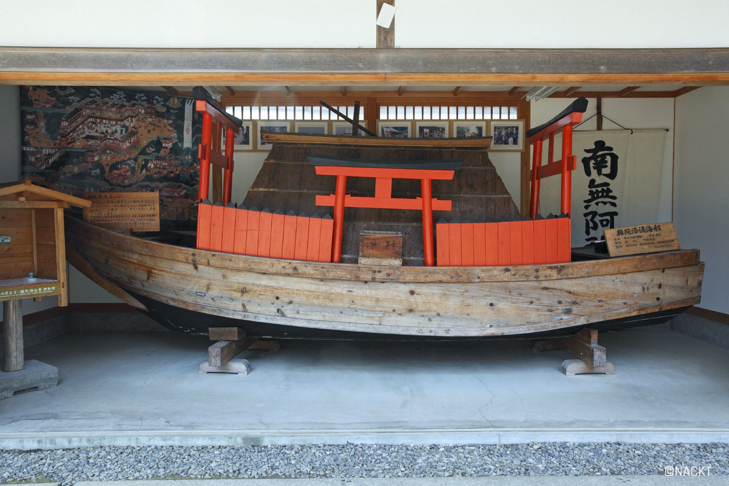 補陀落渡海船の実物大レプリカ 生きながらにして観音浄土を目指す為、約30日分の食糧を積み込み、屋形に人が入ると外から釘を打ちつけて航海に出たとされています
