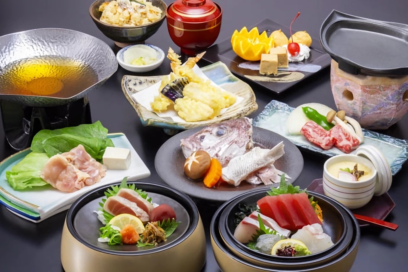 釣り上げた船上で活〆にされ、勝浦港に揚がった天然生鮪の刺身や、熊野灘産の鯛の骨蒸しなど「地産地消」をテーマに調理長がプロデュースした会席料理です